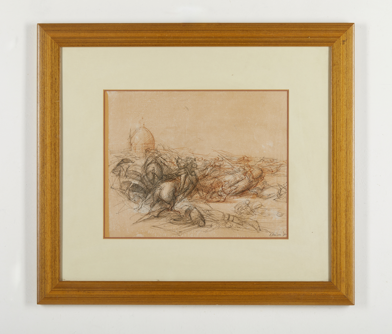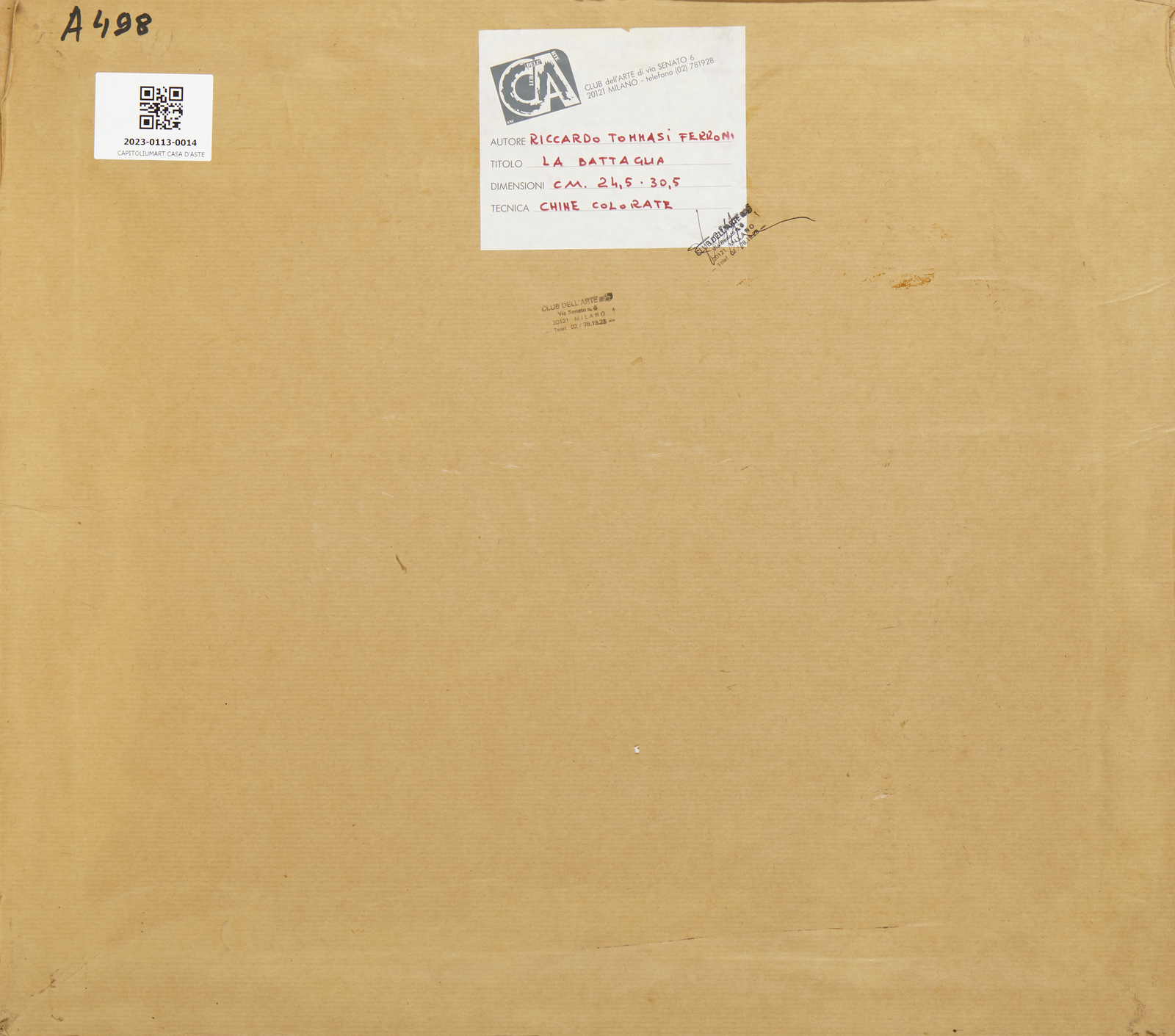 TOMMASI FERRONI RICCARDO (1934 - 2000) La battaglia. China colorata su carta. Cm 30,50 x 24,50. Firma in basso a destra a matita. Al retro timbri e cartiglio descrittivo Club dell'arte di via Senato, Milano. Provenienza: Collezione privata, Milano. Lievi difetti. Cornice presente