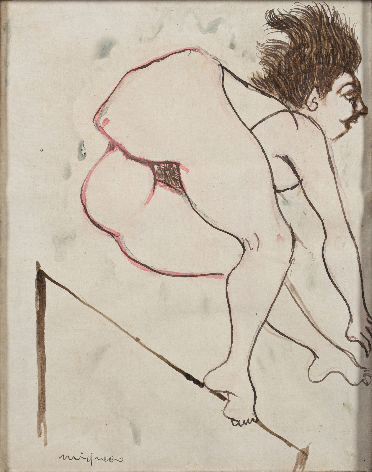 MIGNECO GIUSEPPE (1908 - 1997) Donna che salta l'ostacolo. Tempera su carta su tela. Cm 22,00 x 28,00. Firma in basso a sinistra a penna. Provenienza: Galleria La Torre, Milano; Collezione privata, Treviso. Opera in fase di archiviazione presso l'Archivio Giuseppe Migneco. Cornice presente