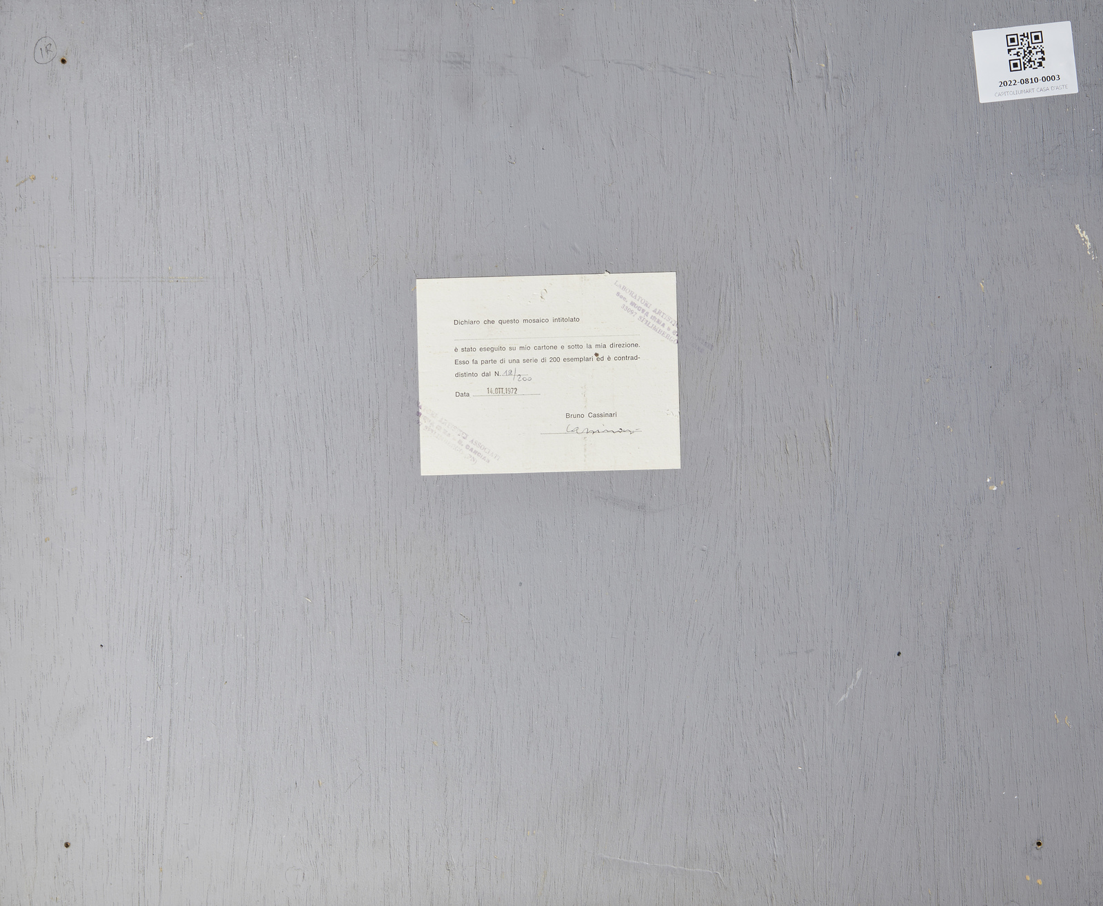 CASSINARI BRUNO (1912 - 1992) Natura morta. 1972. Mosaico. Cm 60,00 x 50,00. 12/200. Firma e tiratura su cartiglio al retro. Provenienza: Galleria Turelli; Collezione privata. Pubblicazione: Alla fine del XX secolo. Verso il terzo millennio, Galleria Turelli, Pistoia, 1999, pag. 56.