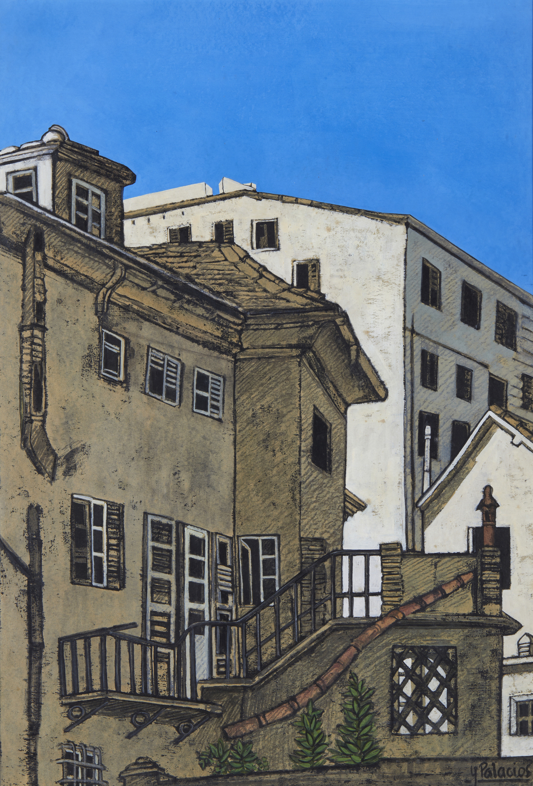 PALACIOS Y ANNAMARIA Y PALACIOS (1938 - 2013) Addio a Corte Lambruschini. Anche le tue finestre si sono arrese. tecnica mista su carta applicata su faesite. Cm 50,00 x 72,00. Firma in basso a destra. Al retro titolo, firma e dedica. Cornice presente