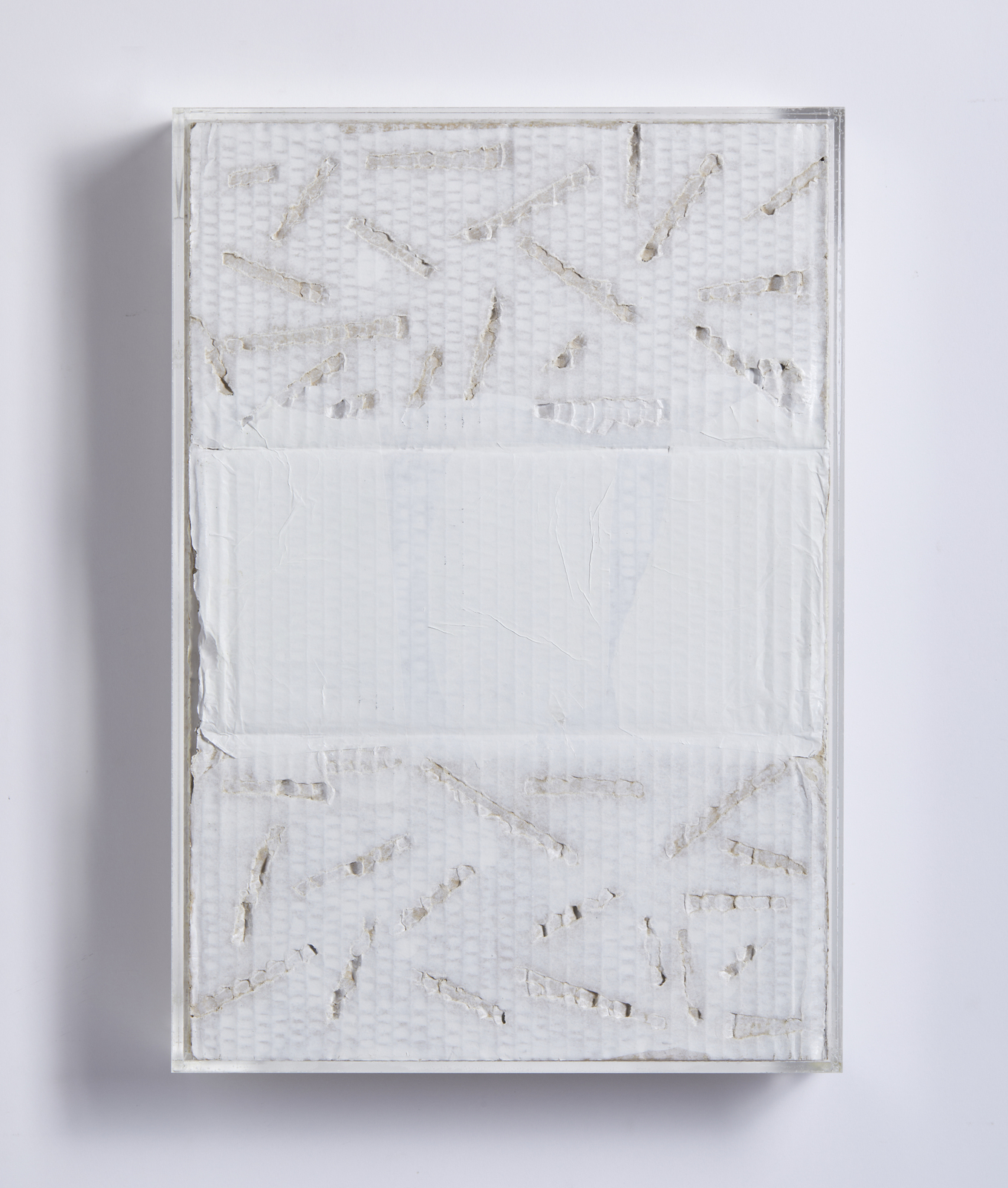 MASI PAOLO (n. 1933) Senza titolo. 2001. Tecnica mista su cartone. Cm 28,50 x 42,00. Al retro firma e anno. Autentica dell'artista su fotografia. Entro teca in plexiglass. Cornice presente