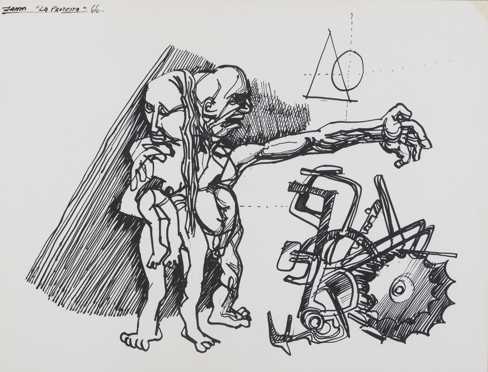 ZANNI SERGIO (n. 1942) La protesta. 1966. China su carta. Cm 44,50 x 34,50. Titolo, firma e anno in alto a sinistra. Lievi difetti. Cornice presente