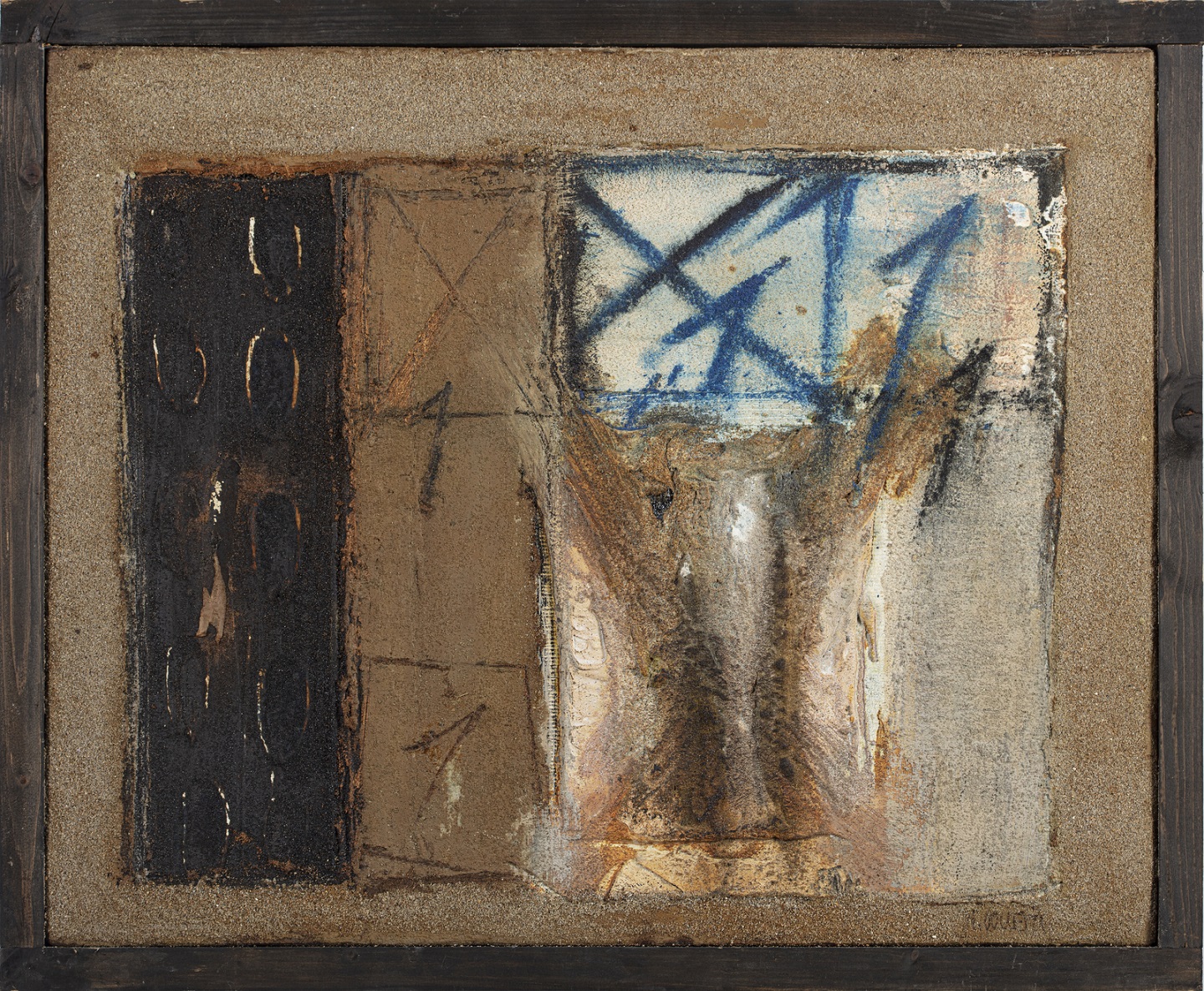 COCCETTA WALTER (n. 1951) Campi Minati. Dal ciclo "Sarayevo - Ricostruzione". 1997. Tecnica mista su tela di juta. Cm 50,00 x 40,00. Firma in basso a destra. Al retro titolo, firma e anno. Provenienza: Collezione privata, Mantova.