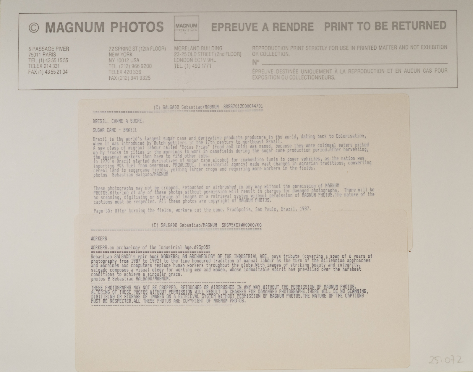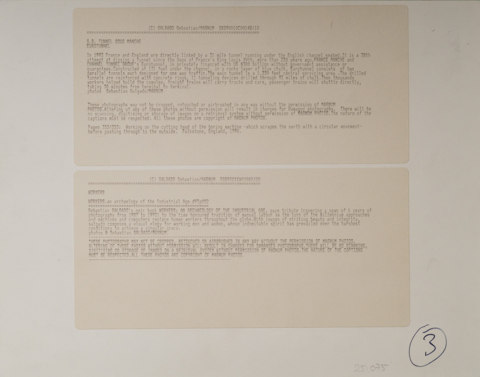 L'epico libro di Sebastiao Salgado "Workers; An archaeology of the industrial age" (Lavoratori; un'archeologia dell'era industriale) rende omaggio (coprendo un arco di 6 anni di fotografia, dal 1987 al 1992) alla tradizione onorata dal tempo del lavoro manuale, mentre la fine del millennio si avvicina e le macchine e i computer sostituiscono i lavoratori umani in tutto il mondo. Con immagini di straordinaria bellezza e integrità, Salgado compone un'elegia visiva per gli uomini e le donne che lavorano, il cui spirito indomito ha prevalso sulle foto più dure.