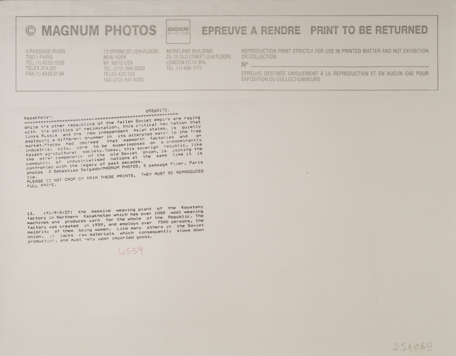 SALGADO SEBASTIAO (n. 1944) Lotto composto da n.4 fotografie della serie "Workers, an archaeology of the Industrial age". Fotografia. Cm 30,20 x 23,70. Canne da zucchero, Brasile, 1987; impianti di tessitura, Koustany factory, Kazakistan; Tunnel della Manica, Eurotunnel, 1990; Cantiere navale, Brest, 1990.Timbro Magnum Photos al retro di ogni fotografia. Timbro copyright Sebastiao Salgado al retro della foto Chantier Navale. Lievi difetti.