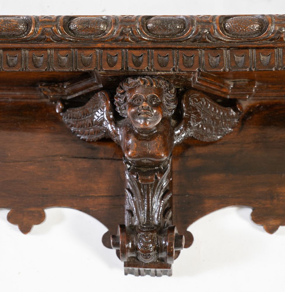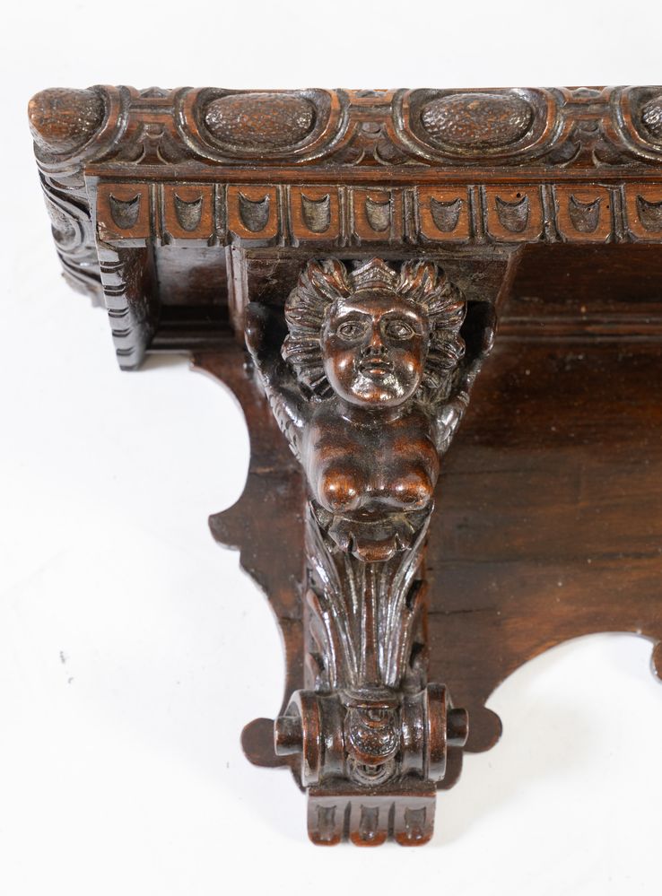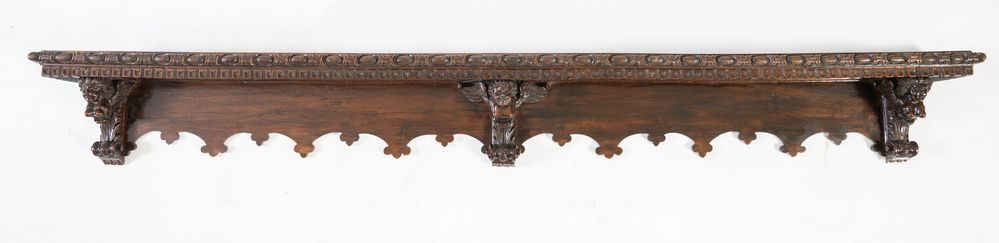 Mensola in massello di noce intagliato. Il piano è profilato da una cornice intagliato con motivi a ovuli, sospeso da una cornice con motivi unghiati e sorretto da tre mensole intagliato con polene. Nord Italia, XIX secolo. Cm 20x181x15.