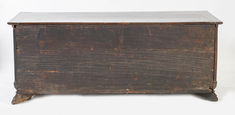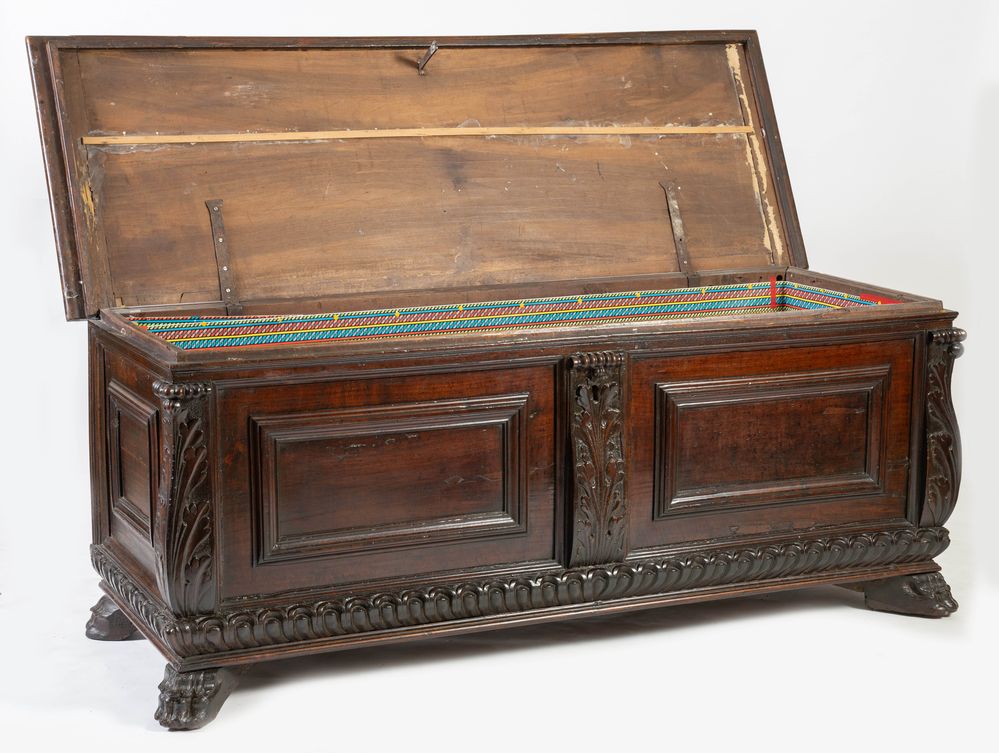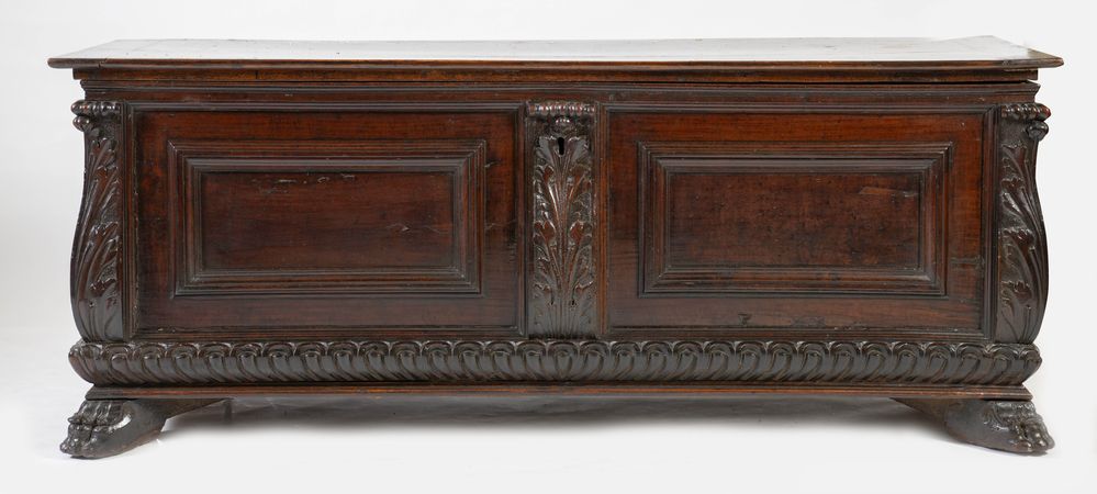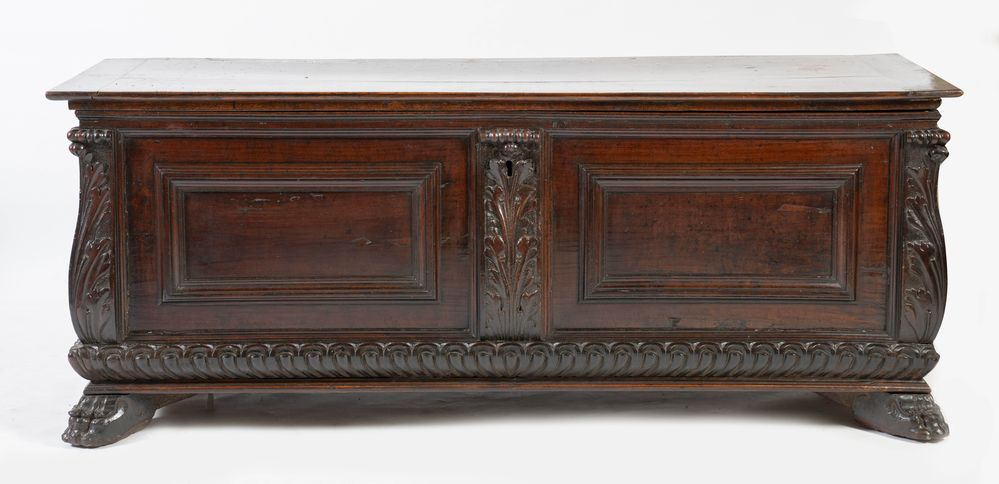 Cassapanca in massello di noce con fronte diviso in due formelle incorniciate. Lombardoveneto, XVII secolo. Scandito da paraste intagliate a guisa di foglia d'acanto. Cornicione bacellato alla base sorretto da piedi di forma ferina. Cm 71x181x62.