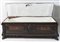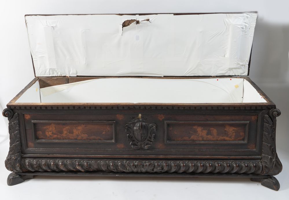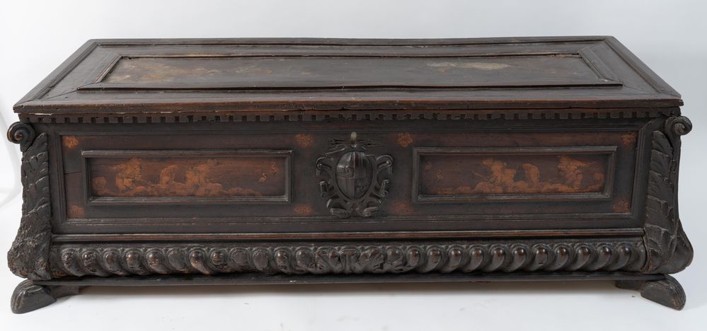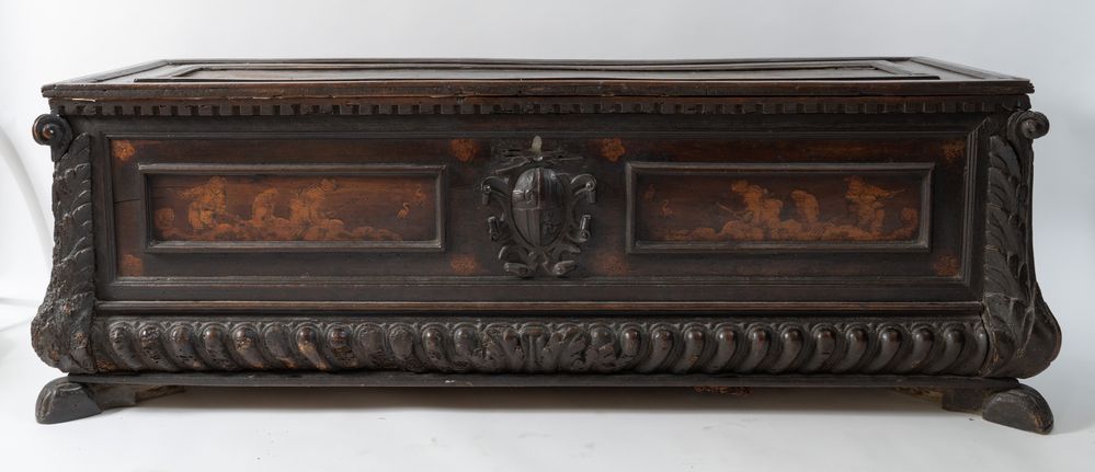 Cassapanca in massello di noce. Bologna/Imola, fine del XVI secolo - inizio del XVIII secolo. Cornicione bacellato e intagliato. Pilastrate agli angoli intagliate a guisa di foglie d'acanto. Sottogola dentellato. Reca stemma gentilizio entro cartiglio nella parte centrale. Lateralmente reca due riserve intarsiate con scene di caccia. Cm 62x185x57. (difetti)