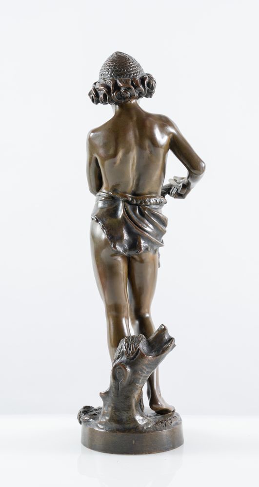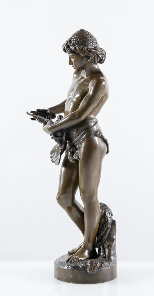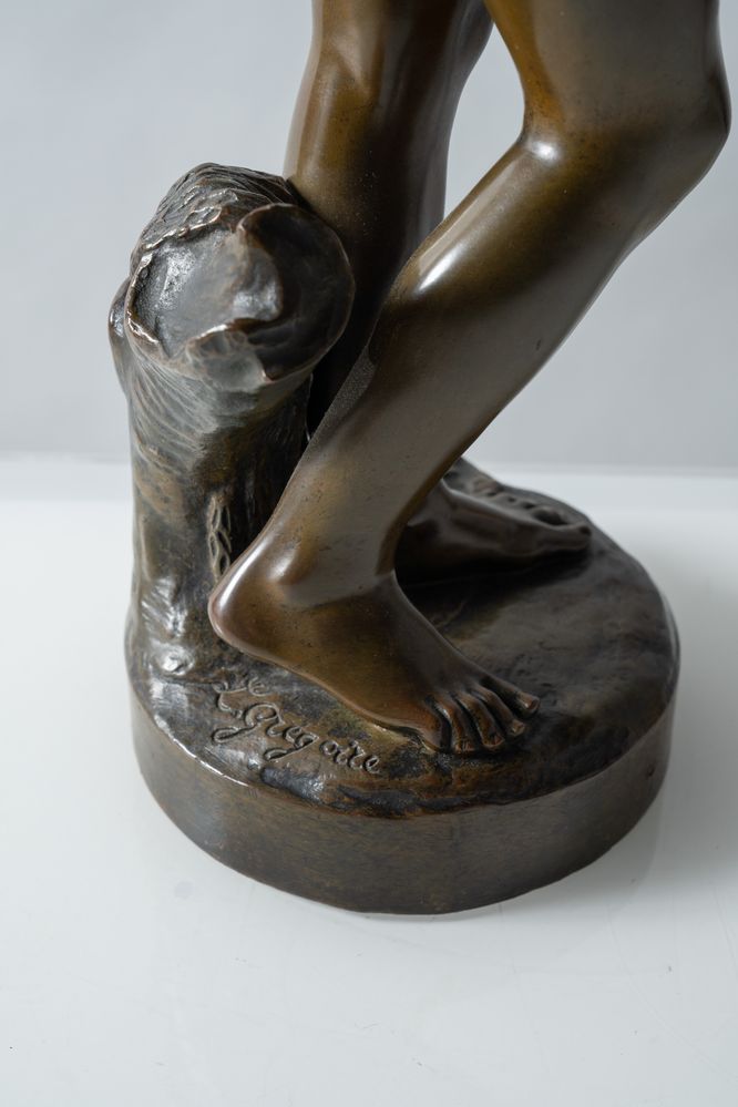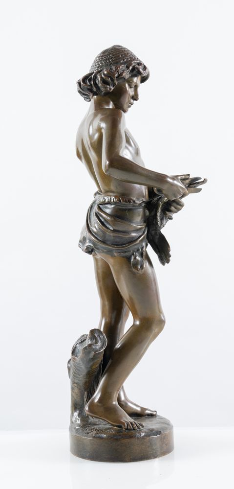 SCULTURA IN BRONZO, raffigurante fanciullo che taglia le piume a un colombo. Cm 47,5x16x16. Opera firmata sulla base L. Gregoire. Francia, fine dell'800.