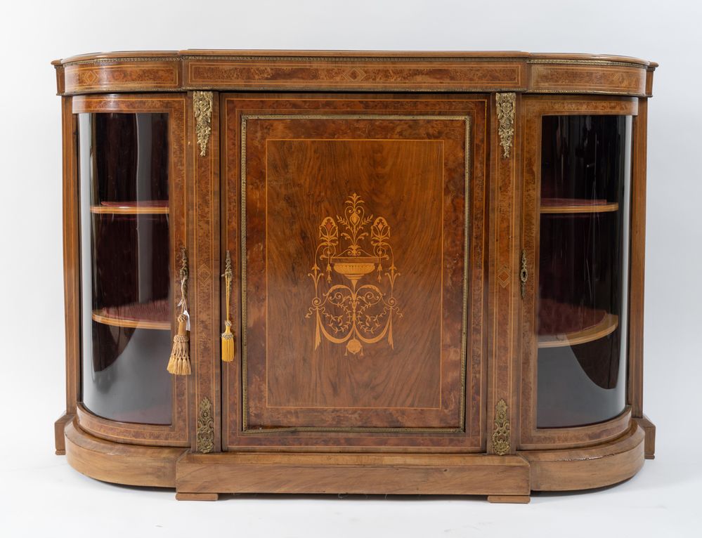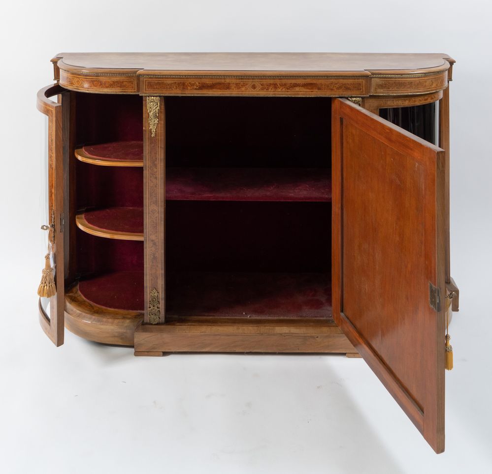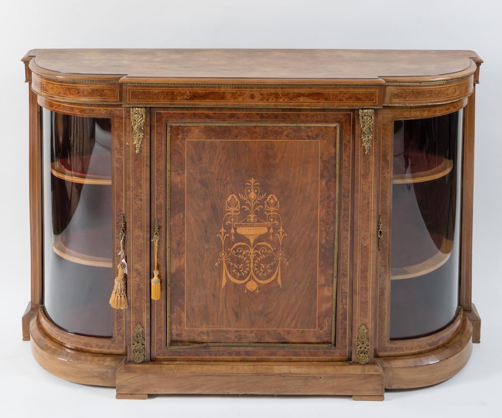 Credenza lastronata in noce, radica di noce e filettature di acero. Applicazioni in bronzo dorato. Inghilterra, ultimo quarto del XIX secolo - inizio XX secolo. Anta centrale con pannello finemente intarsiato con coppa e volute di gusto neoclassico. Ante laterali ricurve a vetro. Cm 97x148,5x36.