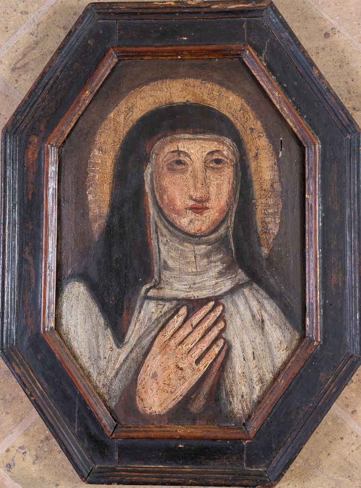 Maestro del XVIII secolo. “Santa”. Olio su tavola ottagonale. Cm 39x26,5....