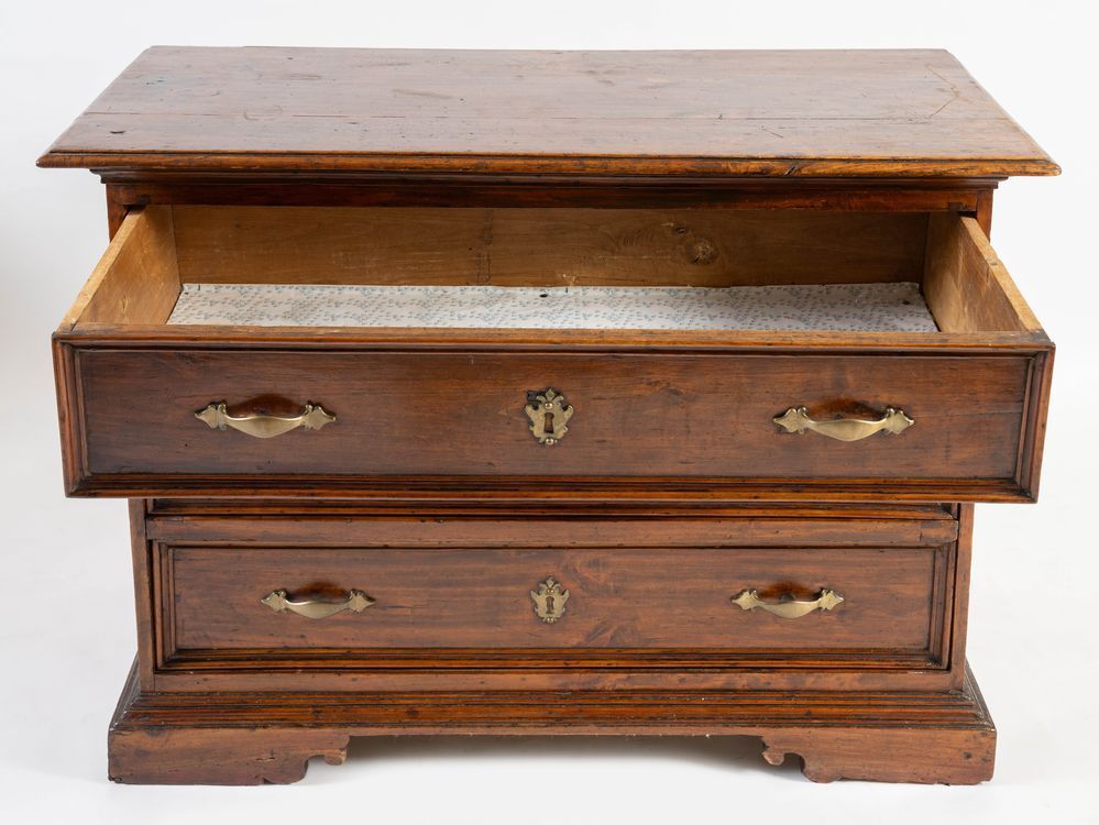Piccolo canterano in legno dolce. Emilia, ultimo quarto del XVII secolo. Cm 89,5x118x57. Ferramenta originale.