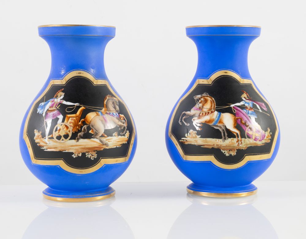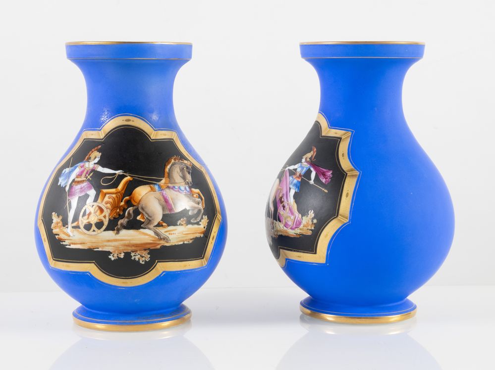 Coppia di vasi in porcellana blu reale opaco. Francia, verso la metà del XIX secolo. Recano riserve con scene di bighe trainate da cavalli. Cadauno di cm 28x18.