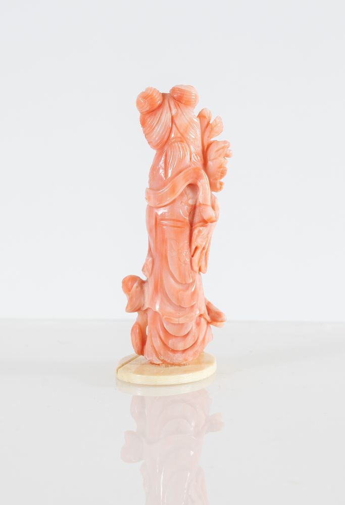 Scultura in corallo rosa, raffigurante Geisha con fiori. Arte orientale, probabilmente Cina, fine del XIX secolo - inizi del XX secolo. H. cm 8.
