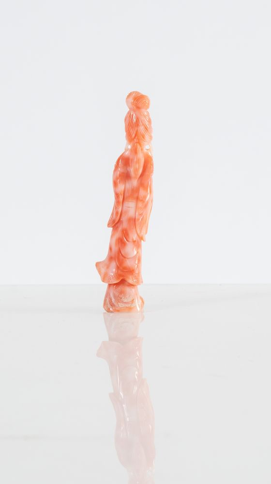 Scultura in corallo rosa, raffigurante Geisha longilinea. Arte orientale,...
