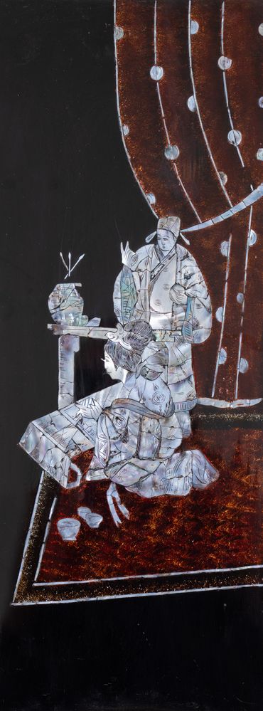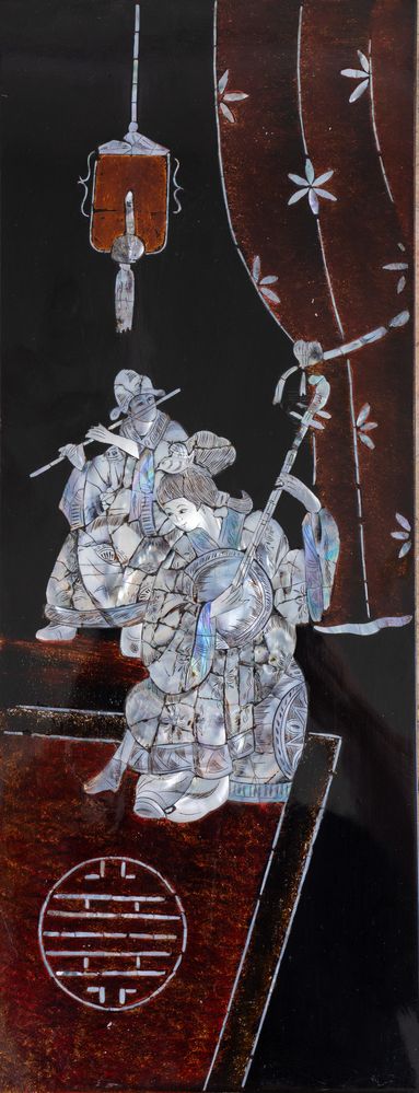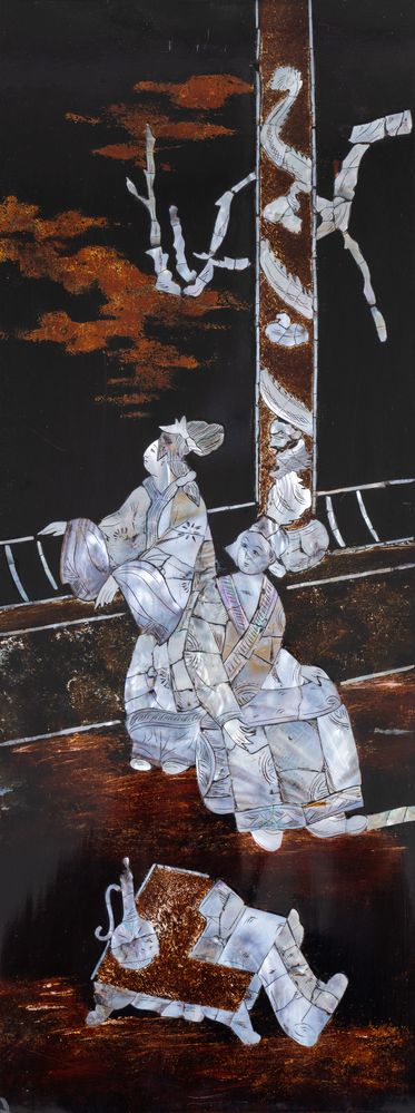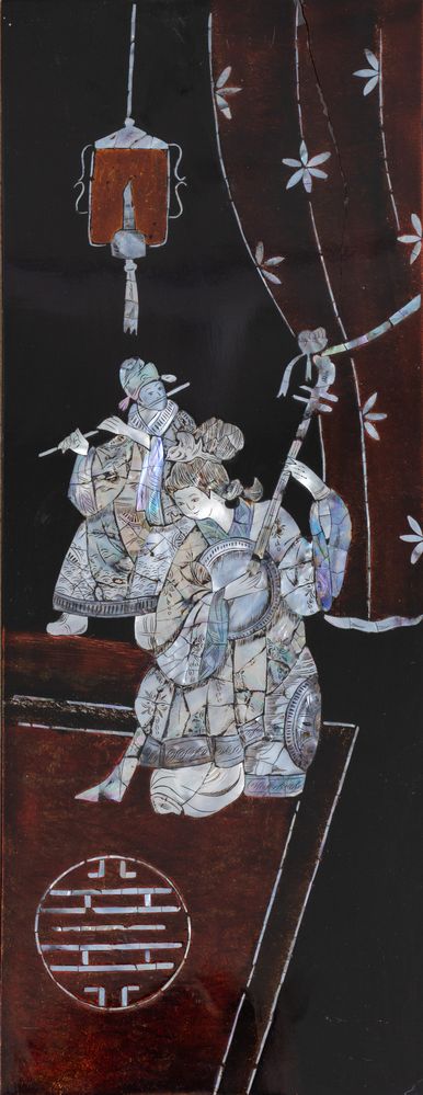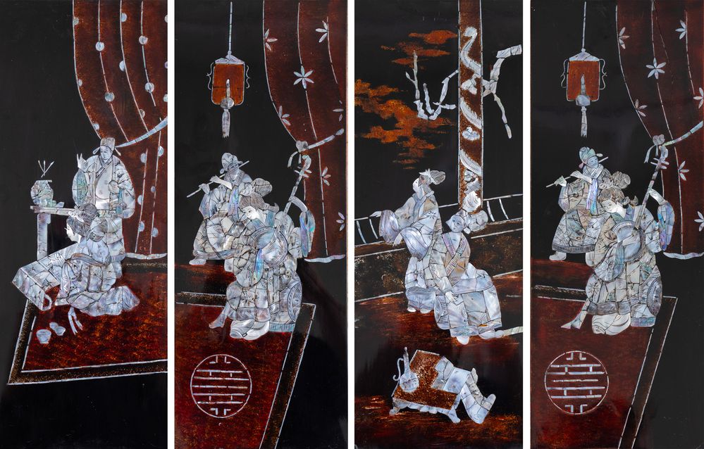 Lotto composto di quattro pannelli in lacca con applicazioni in madreperla....