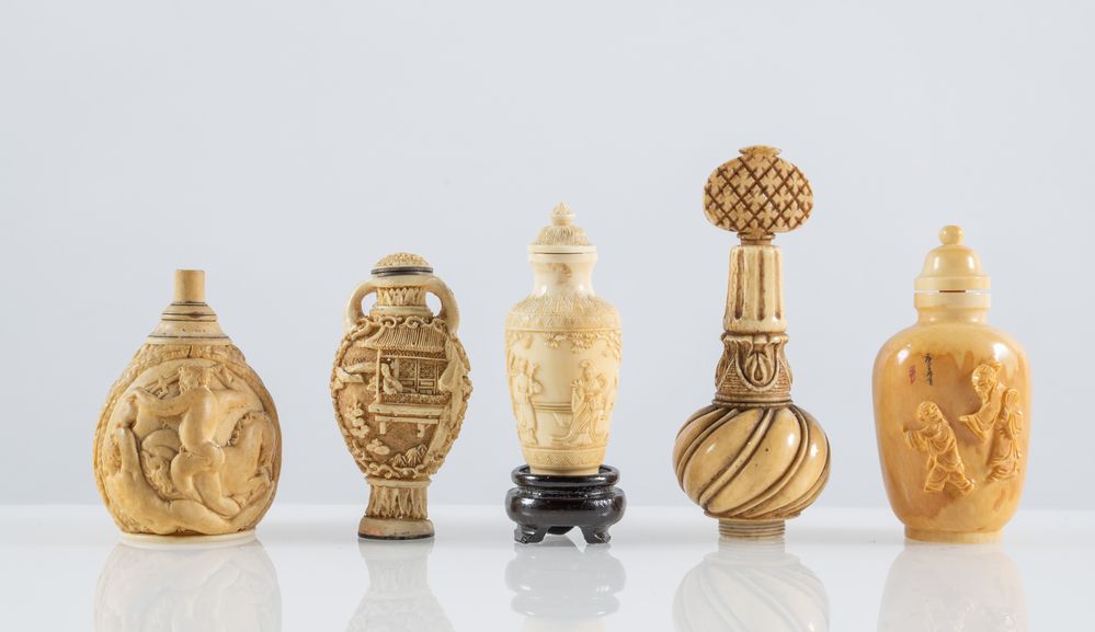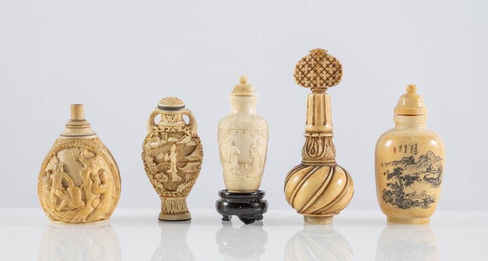 Lotto composto da cinque snuff bottle in avorio intagliato. XIX secolo. La più grande cm 9,5 la più piccola cm 6,5. Lotto accompagnato da certificato CITES.