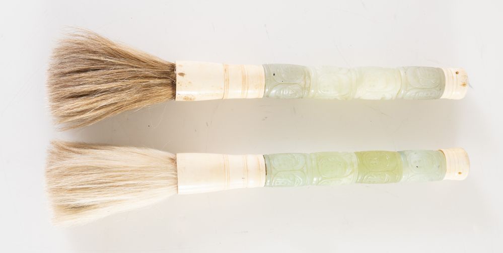 Coppia di pennelli da calligrafia, in giada e materiale prezioso. Giappone,...