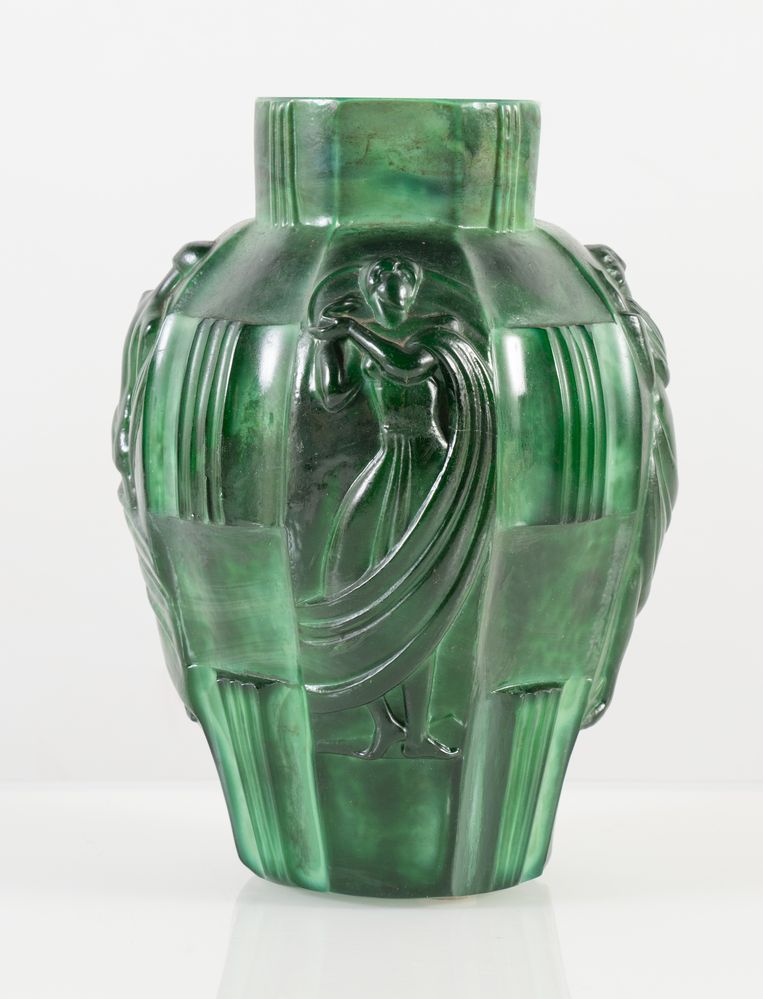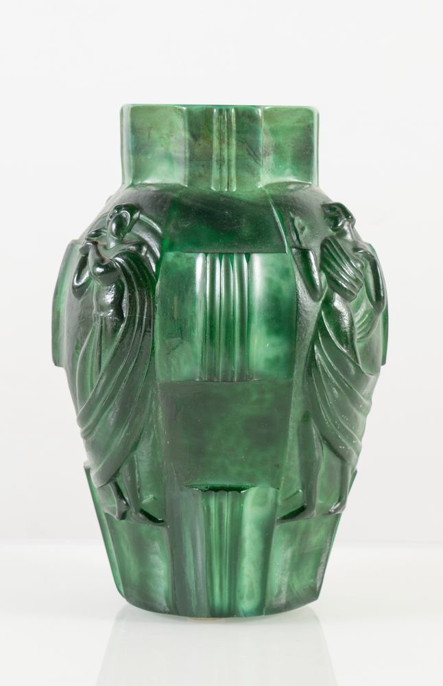 Vaso in pasta vitrea verde di gusto decò. Primi anni 30 del XX secolo. Cm 25xdiametro 19.