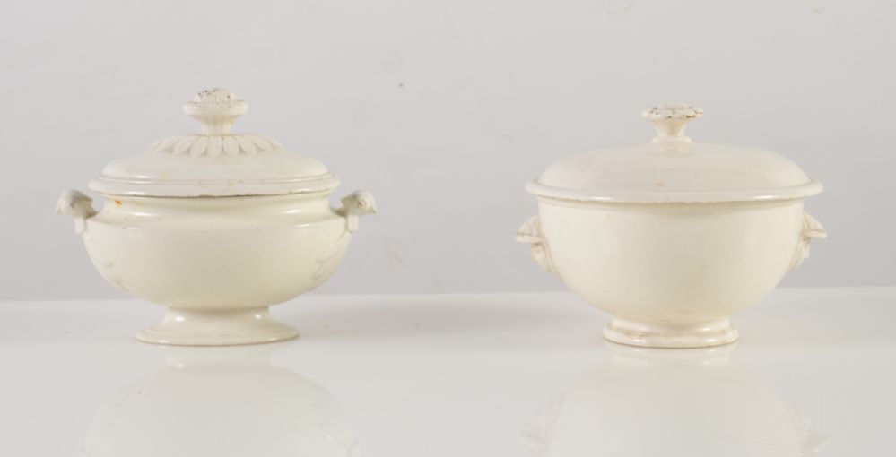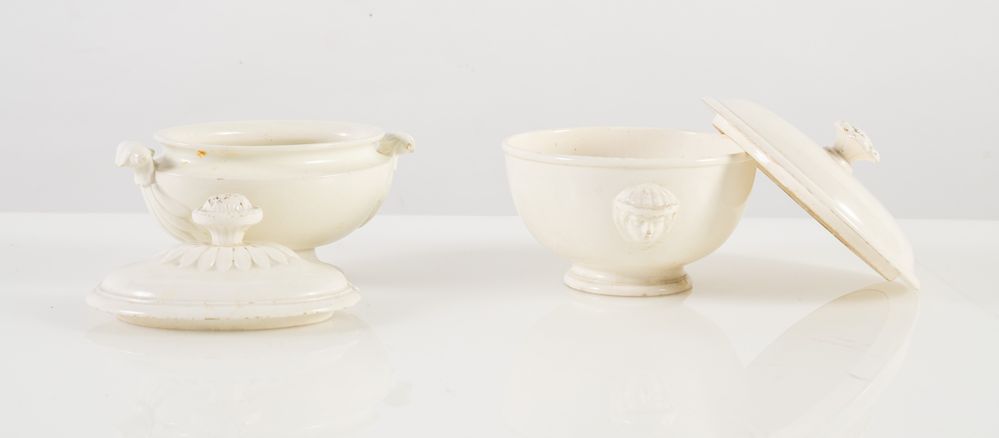 Coppia di salsiere in terraglia bianca. Manifattura emiliana o veneta, verso la metà del XIX secolo. Rispettivamente di cm 13,5x16,5x10 e cm 12x17x15.