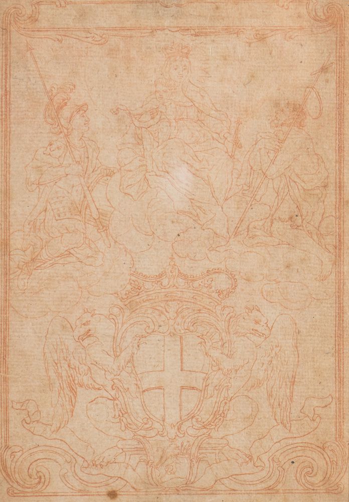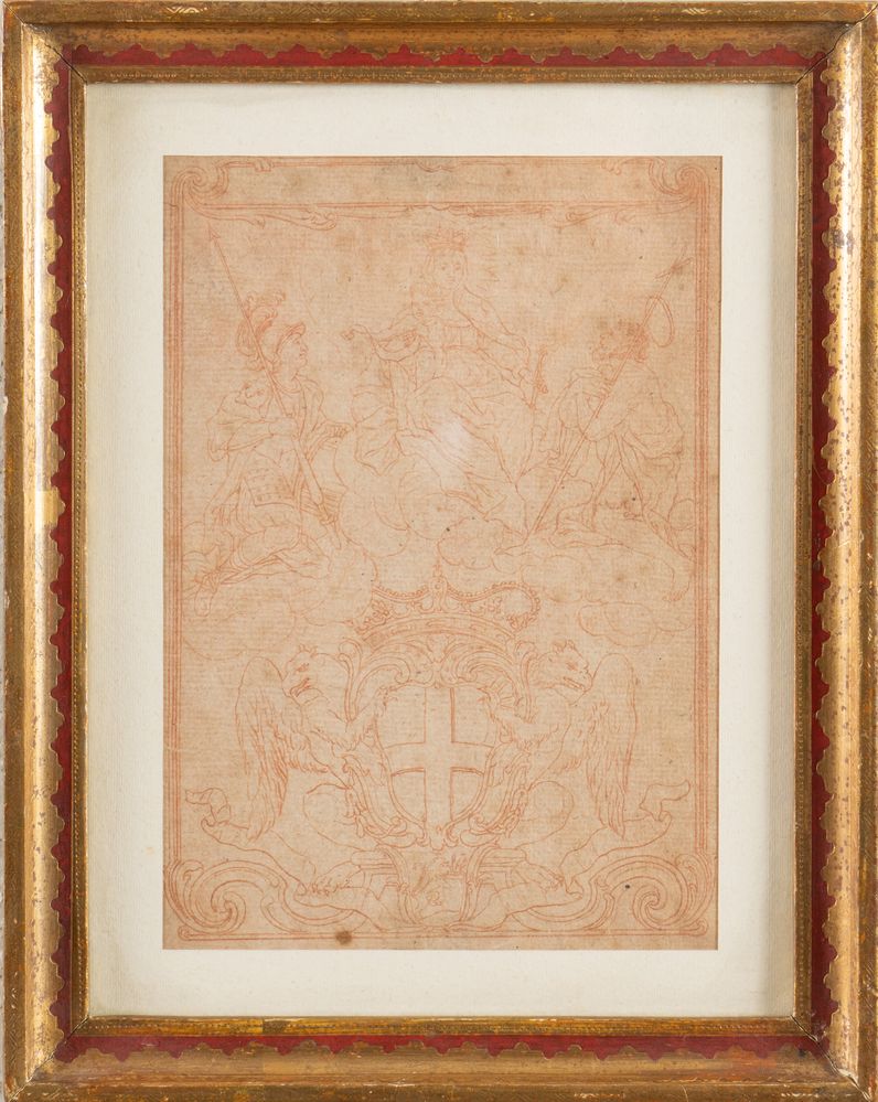 Maestro del XVII secolo. "Madonna in gloria con santi e stemma". Disegno a sanguigna su carta. Cm 20x14.