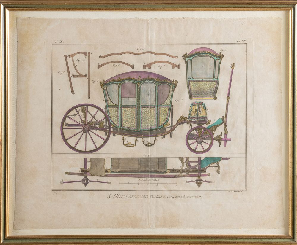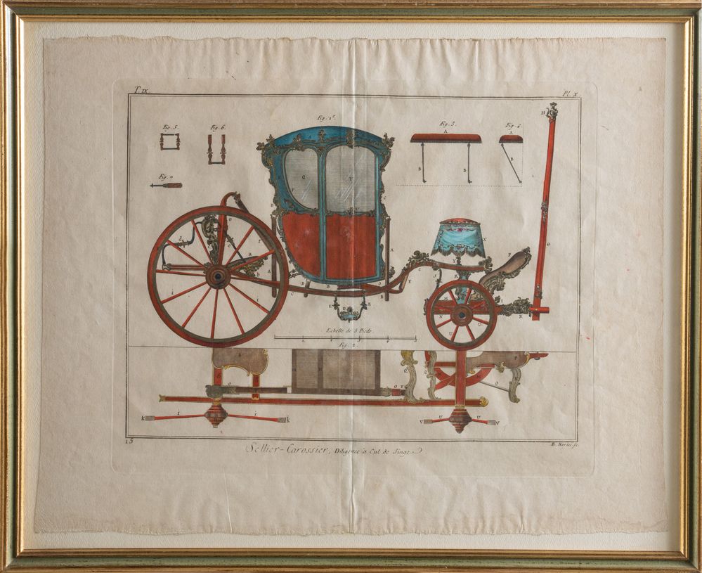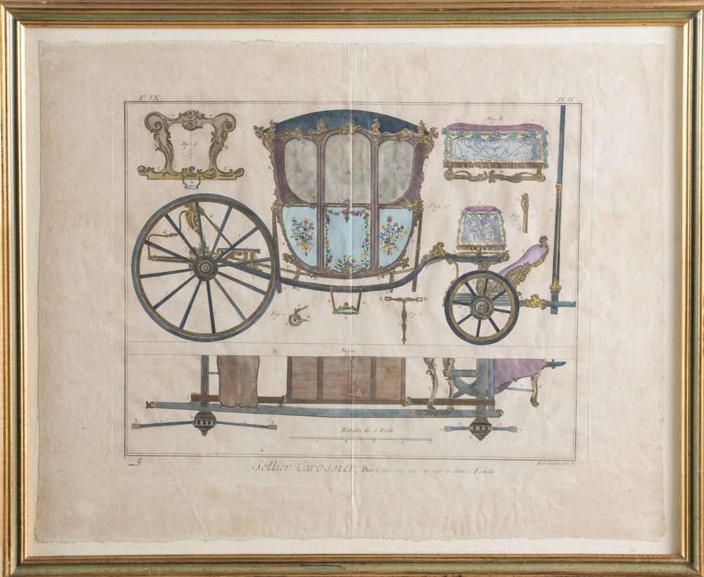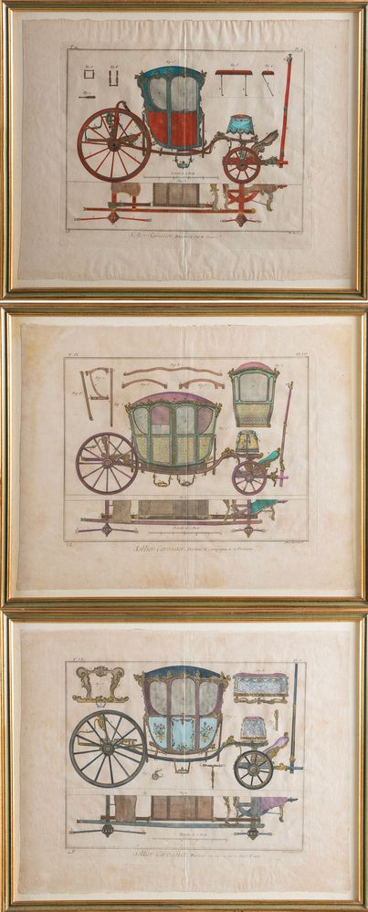Lotto composto da tre incisioni, raffiguranti sezioni di carrozze. Francia, XVIII secolo. Ciascuna di cm 35x43.