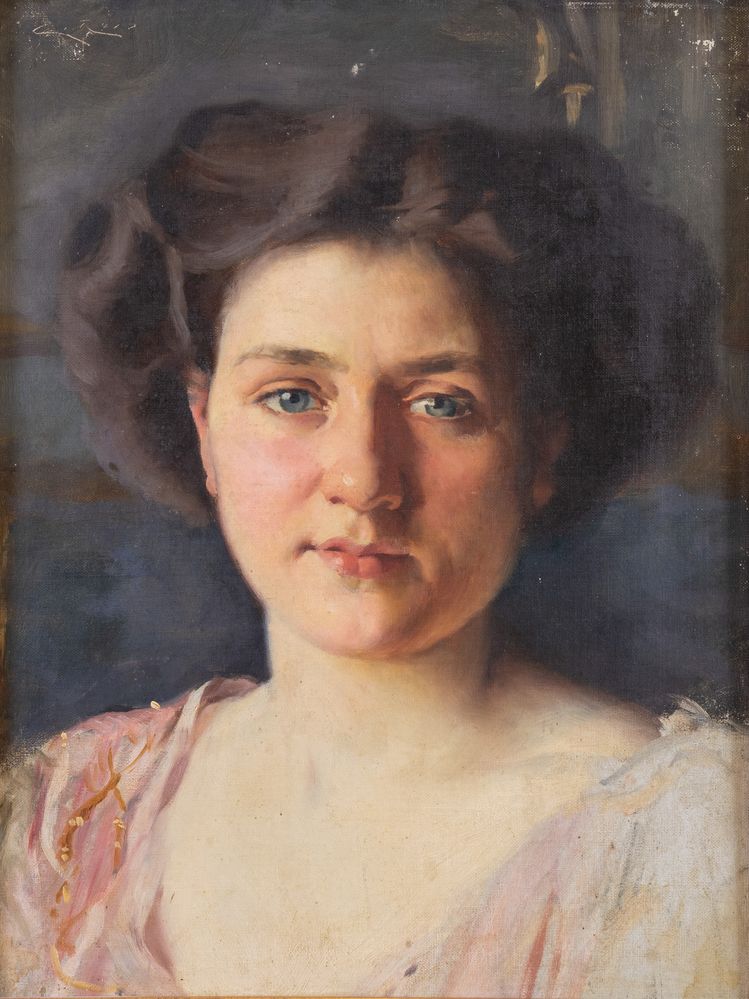 CARLOS REIS (Torres Novas 1863 – Coimbra 1940), attr. "Ritratto femminile", 1913. Olio su tela applicata su tavola. Cm 48x36,5. Opera firmata in alto a sinistra Carlos Reis. Al retro reca iscrizione. Al retro opera firmata e datata Carlos Reis 1913.