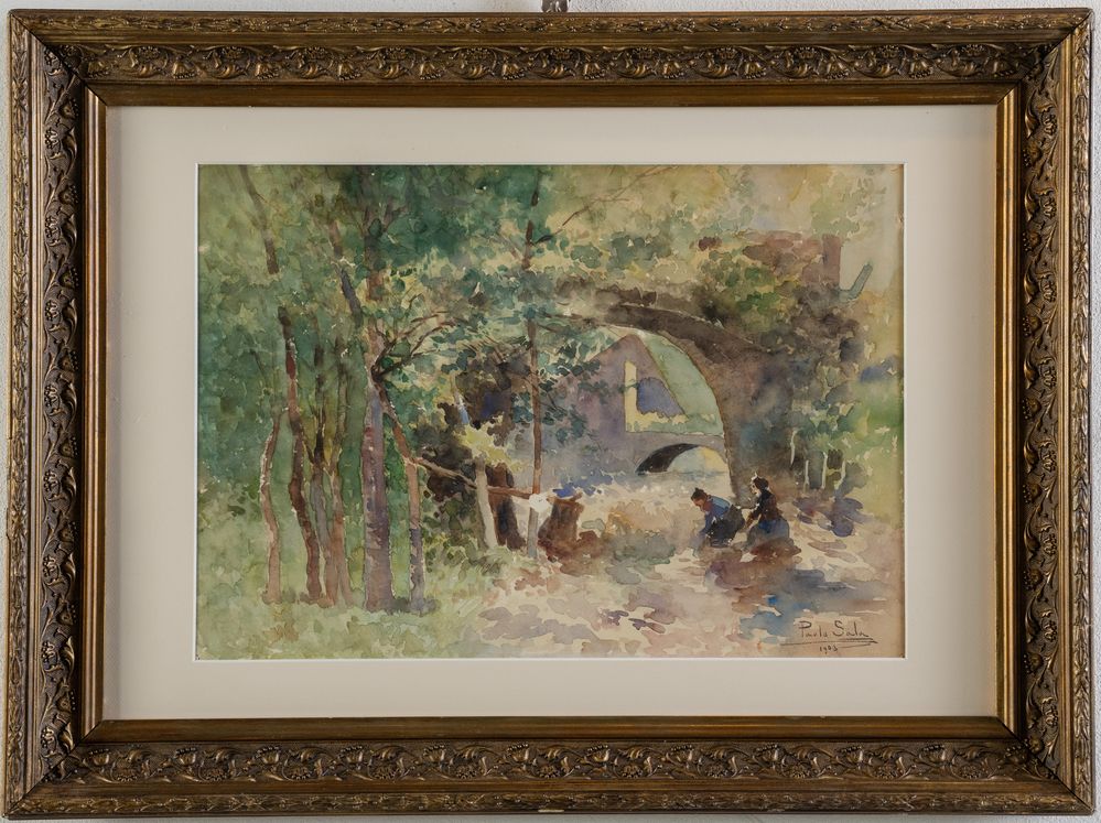 PAOLO SALA (Milano 1859 - 1924) "Lavandaie", 1903. Acquerello su carta. Cm 34x48,5. Opera firmata e datata in basso a destra Paolo Sala 1903.