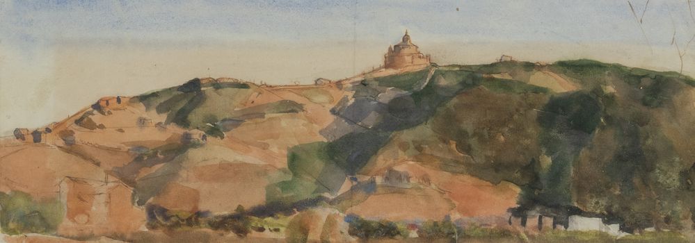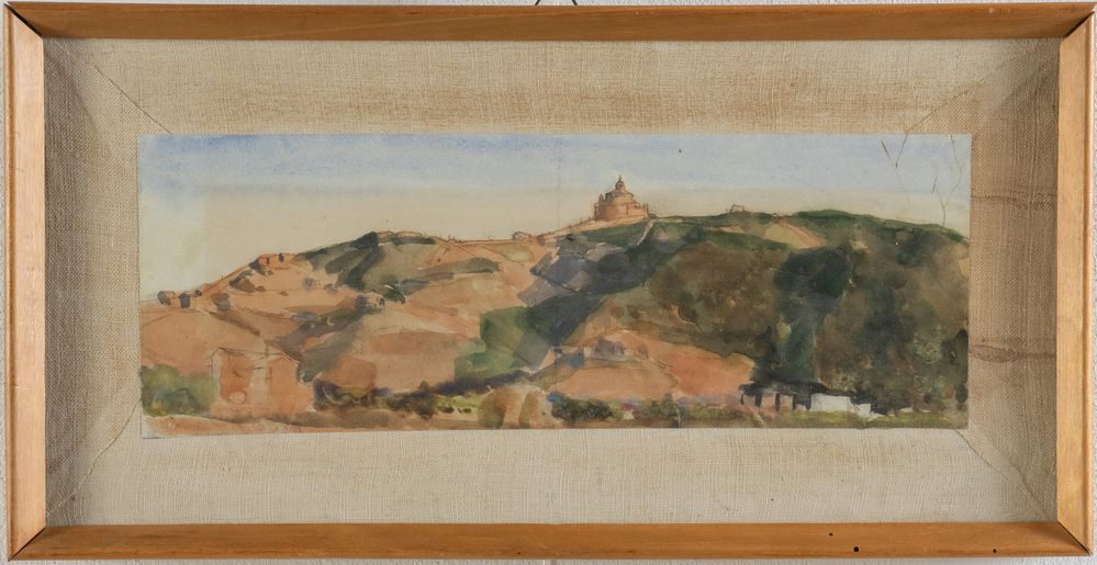 ARNALDO GENTILI (Bologna 1890 - 1988) "San Luca". Acquerello su carta. Cm 13,7x39. Al retro opera firmata Gentili. Al retro reca dedica firma del'artista.