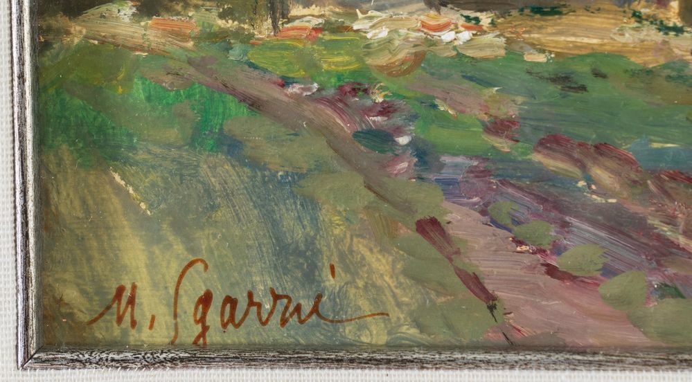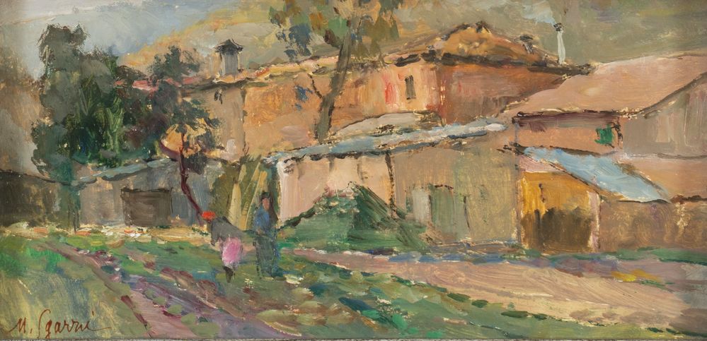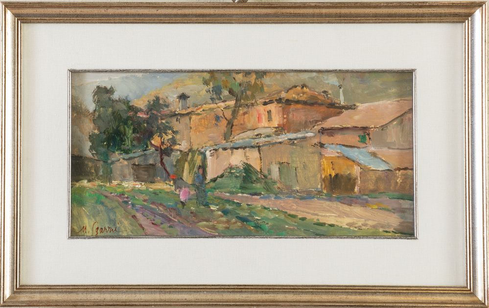 UMBERTO SGARZI (Bologna 1921 - 2017) "Veduta con case". Olio su tavola. Cm 20x40. Opera firmata in basso a sinistra U. Sgarzi.