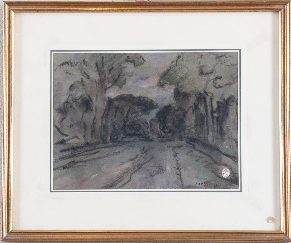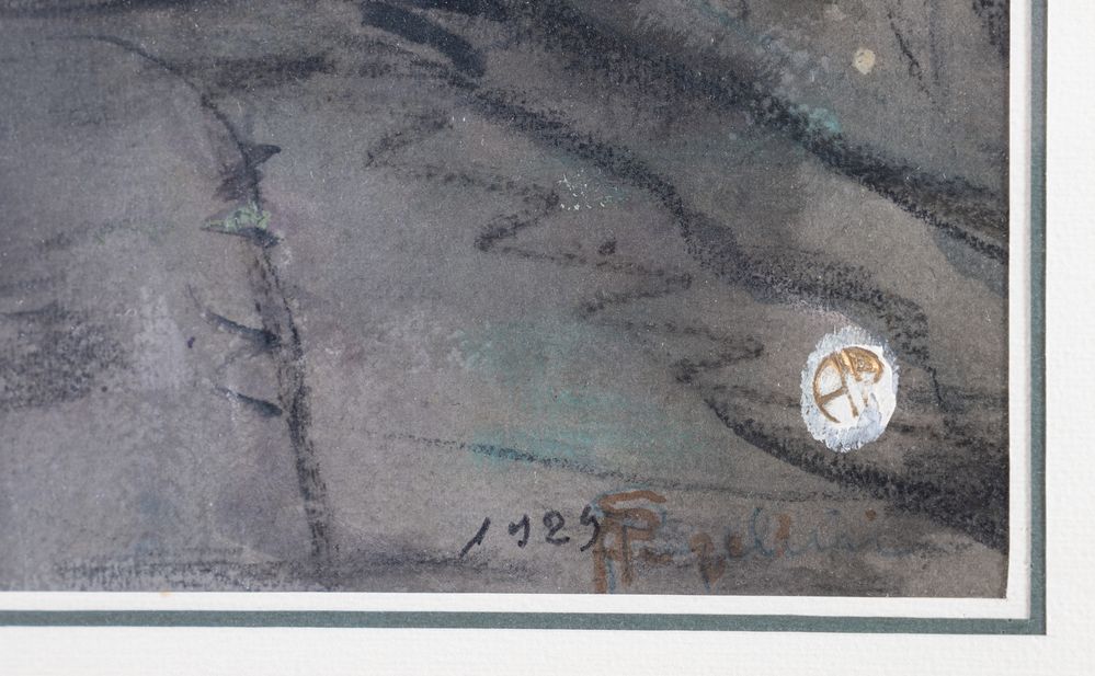 PIETRO ANGELINI (Forlì 1888 – Roma 1977) "Paesaggio", 1925. Tecnica mista su carta. Cm 21x28,5. Opera firmata e datata in basso a destra 1925, P. Angelini. In basso a destra reca sigillo con sigla AP. Opera acquistata direttamente dall'artista dall'attuale proprietà.
