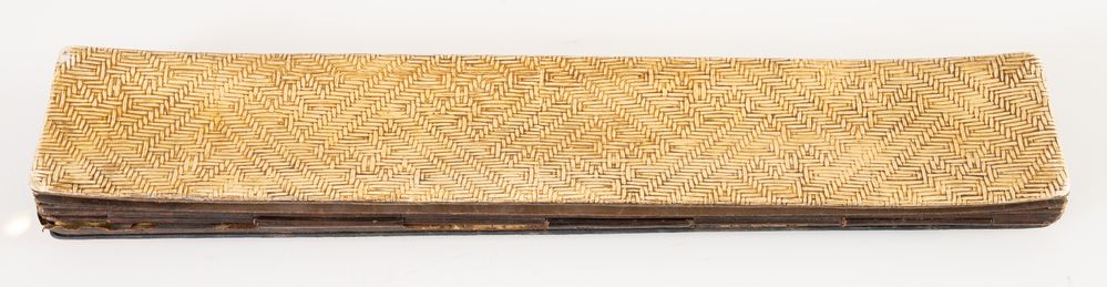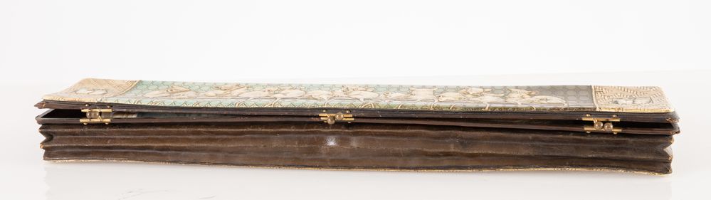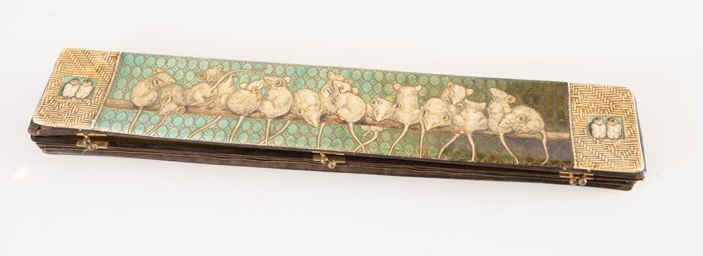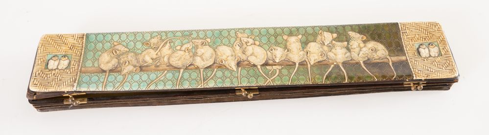 Scatola custodia a soffietto in cuoio con coperchio lavorato con decorazione a rilievo policroma raffigurante topolini e rondini. Firenze?, fine del XIX secolo - inizio del XX secolo. Cm 10x53x(chiusa)4. Da aperta, spessore: cm 6.