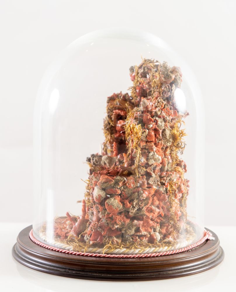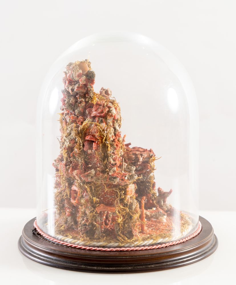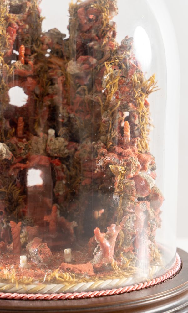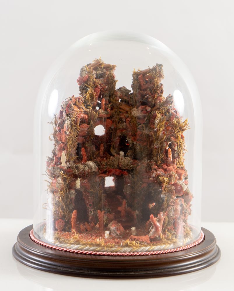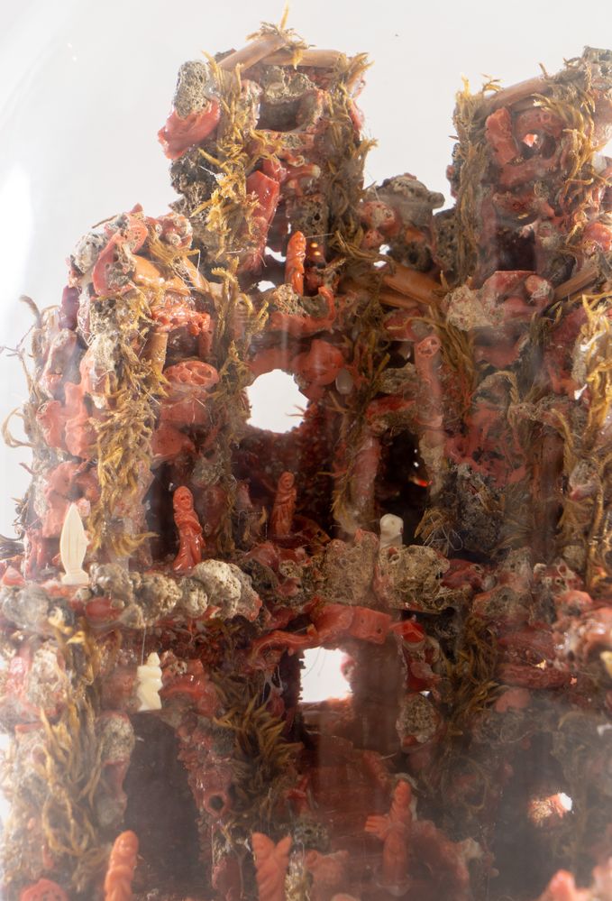 Piccolo presepe con figure in corallo e pietra. Sicilia, inizi del XX secolo. Entro teca in vetro. Cm 25x diametro 24,5.