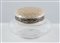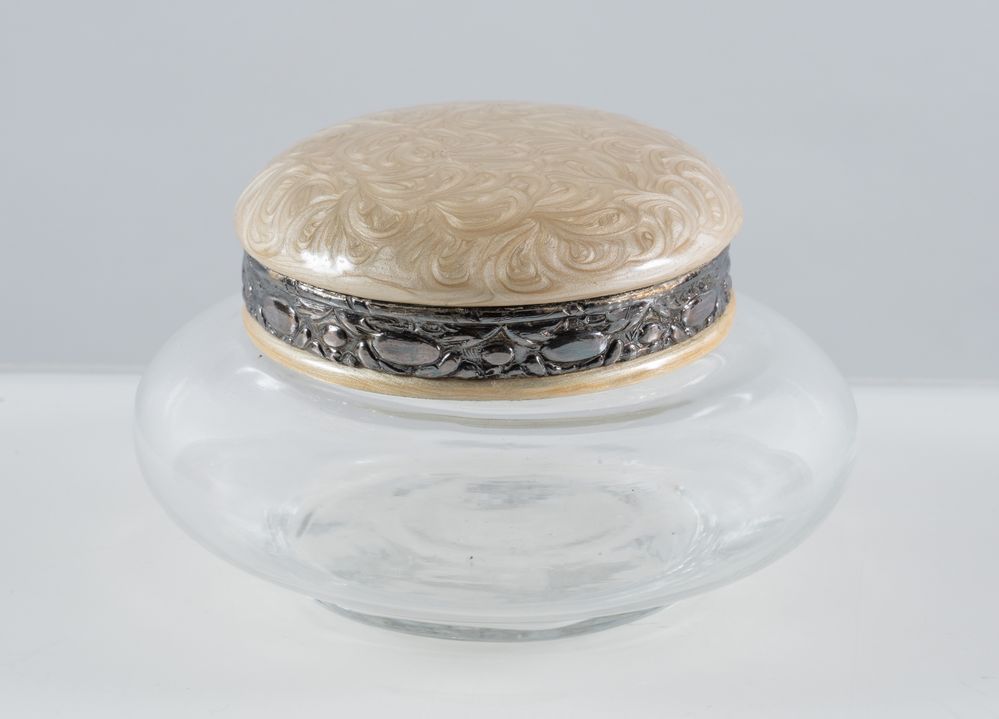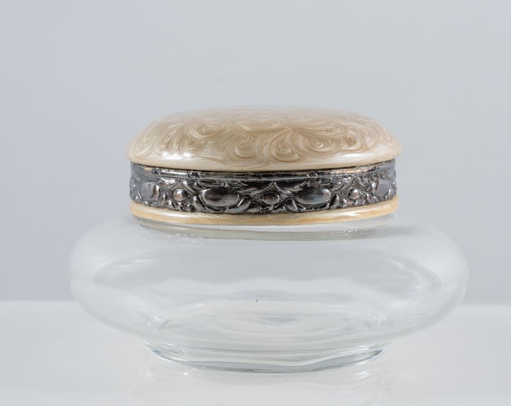 Scatola in vetro con coperchio in smalto su metallo argentato. XX secolo. Cm 7,5x diametro 11,5.
