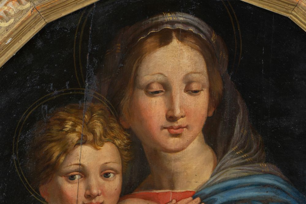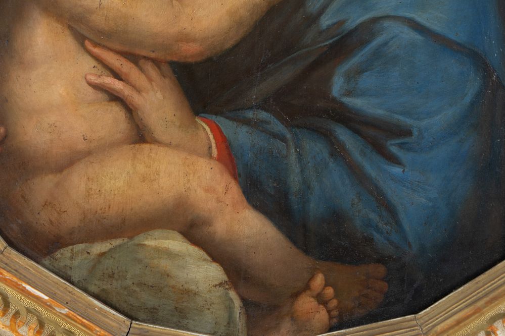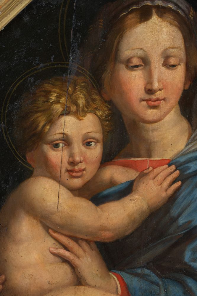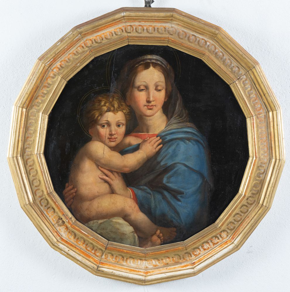 Maestro del XVIII secolo. "Madonna con bambino". Olio su tavola. Cm 61x61.