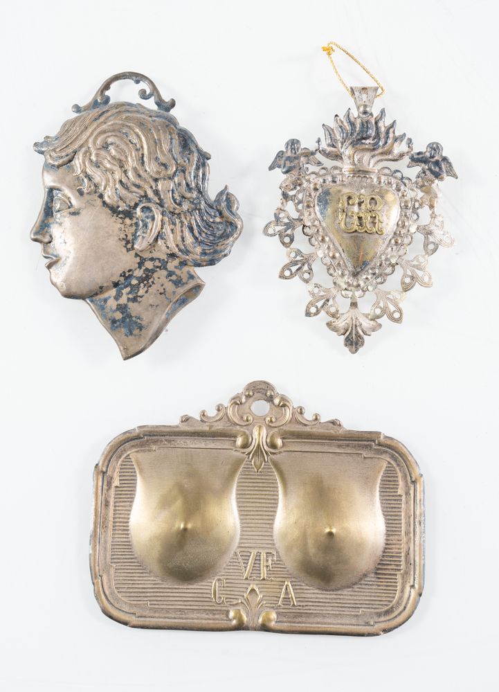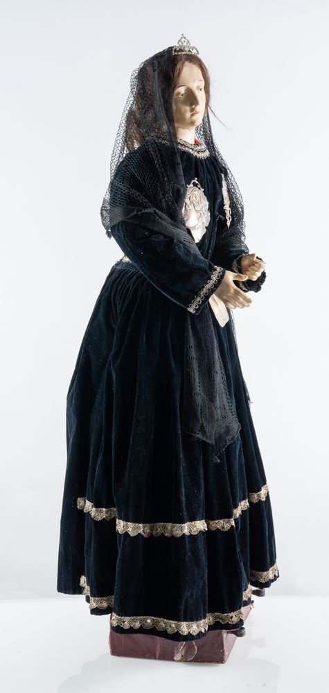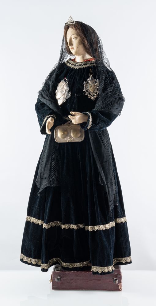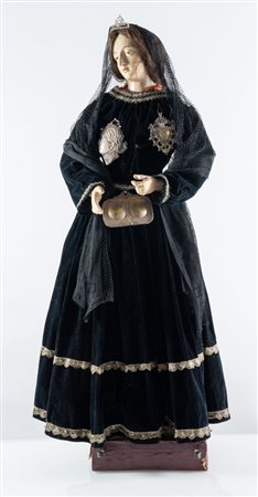 Scultura in cartapesta e stoffa, raffigurante santa vestita di nero con applicati ex voto e grazia ricevuta. XIX secolo. Cm 117x42x30.