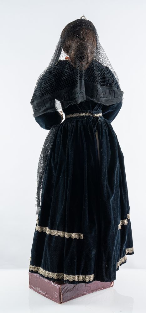 Scultura in cartapesta e stoffa, raffigurante santa vestita di nero con...