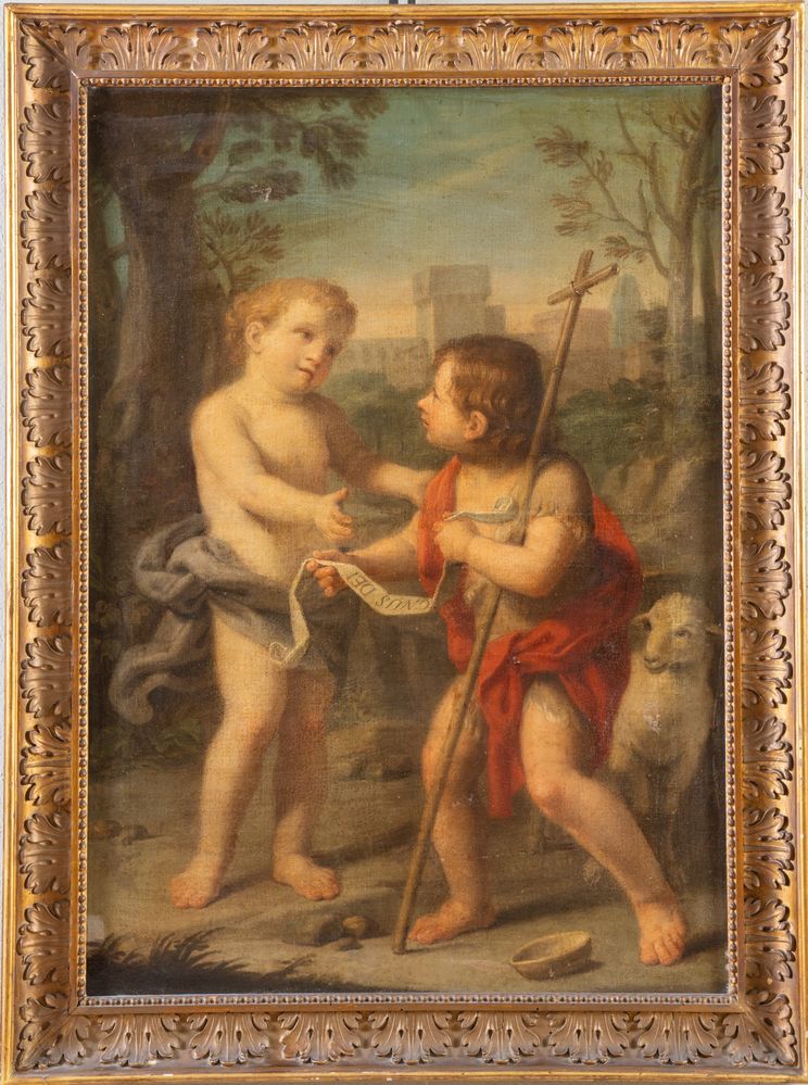 JACOPO ALESSANDRO CALVI, detto il Sordino (Bologna 1740 – 1815) "Gesù fanciullo e San Giovanni Battista". Olio su tela. Cm 89x63.