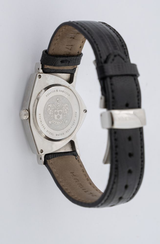 Cassa di forma in acciaio, corona marcata, lunetta in acciaio, anse con elementi asimmetrici, quadrante nero lucido, indici applicati, movimento al quarzo, cinturino in pelle originale, chiusura doppia deployant in acciaio marcata Hamilton; vetro minerale.