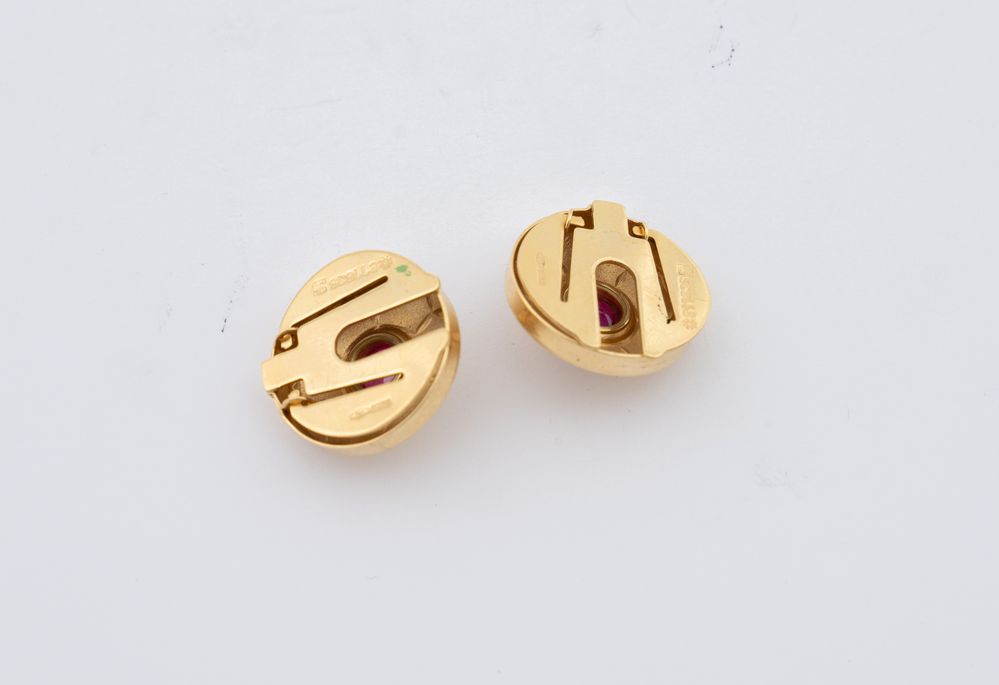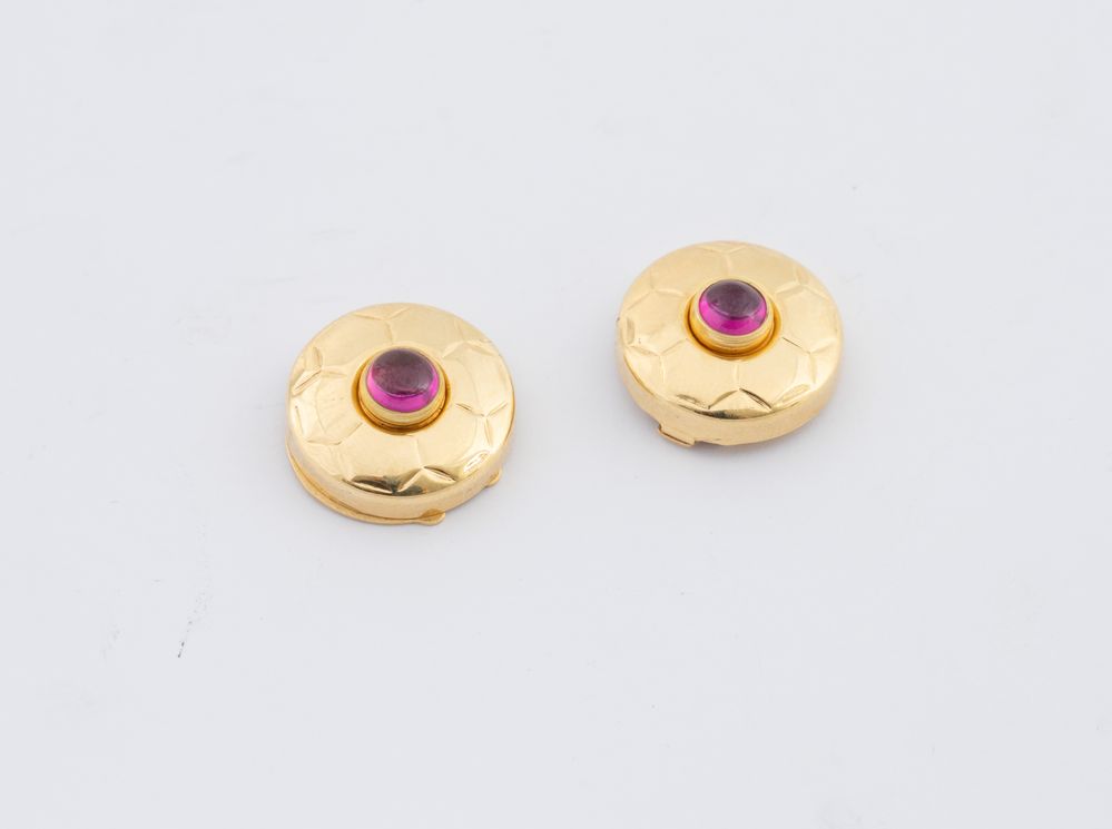 Paio di copribottoni da sparato in oro giallo 18K, ciascuno di forma circolare, decorato a motivo geometrico e centrato da cabochon rosso. Peso complessivo 6,0 grammi.