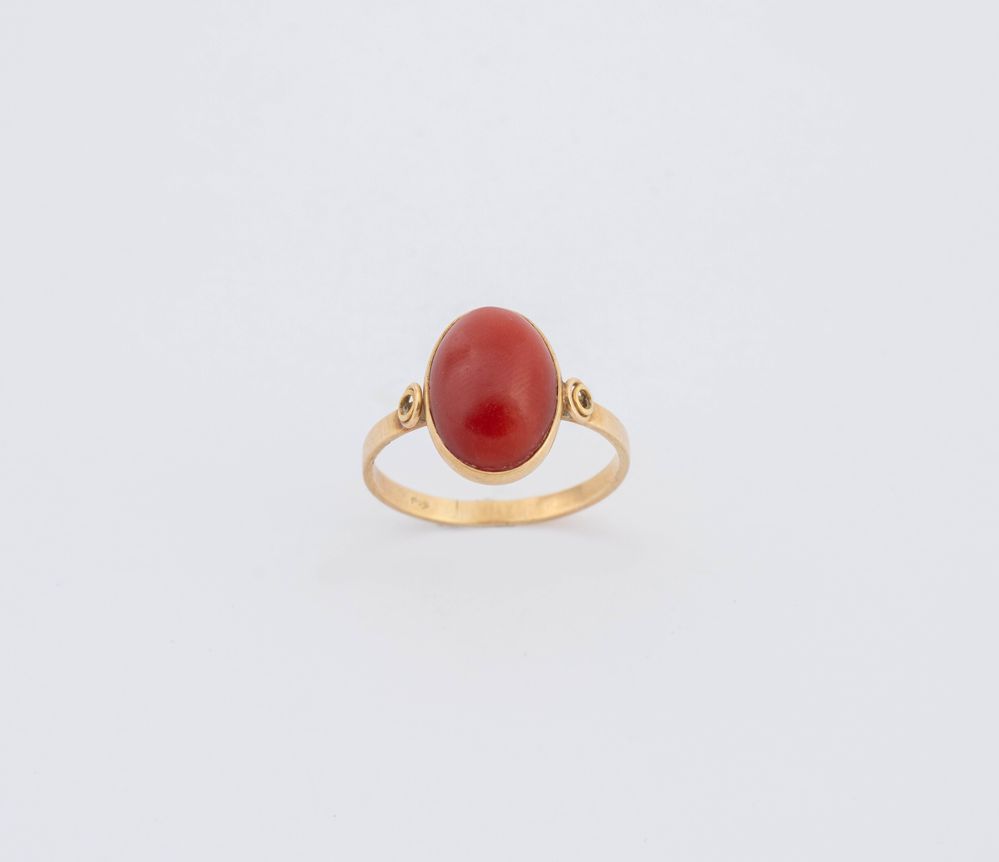 Anello in oro giallo 18K, centrato da cabochon ovale di corallo rosso...