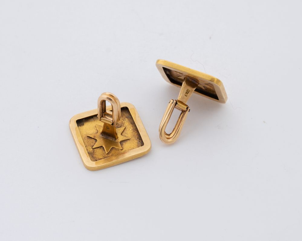 Paio di gemelli in oro giallo 18K, di forma quadrata, formella incisa con...