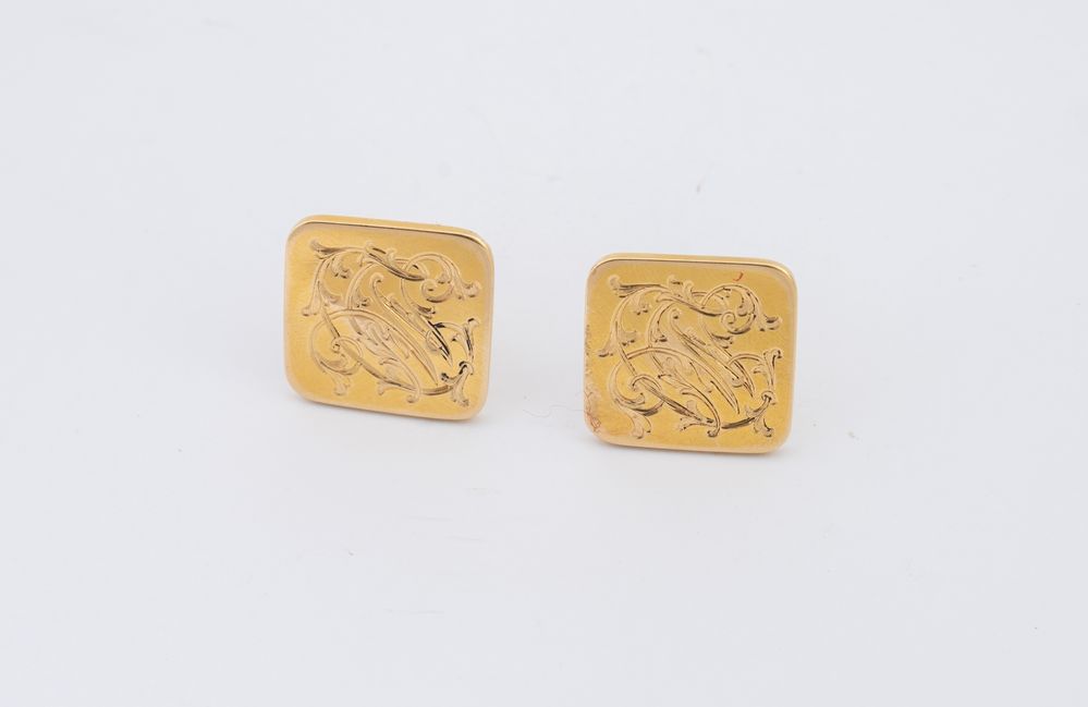 Paio di gemelli in oro giallo 18K, di forma quadrata, formella incisa con cifre “MD”. Peso complessivo 8,1 grammi.