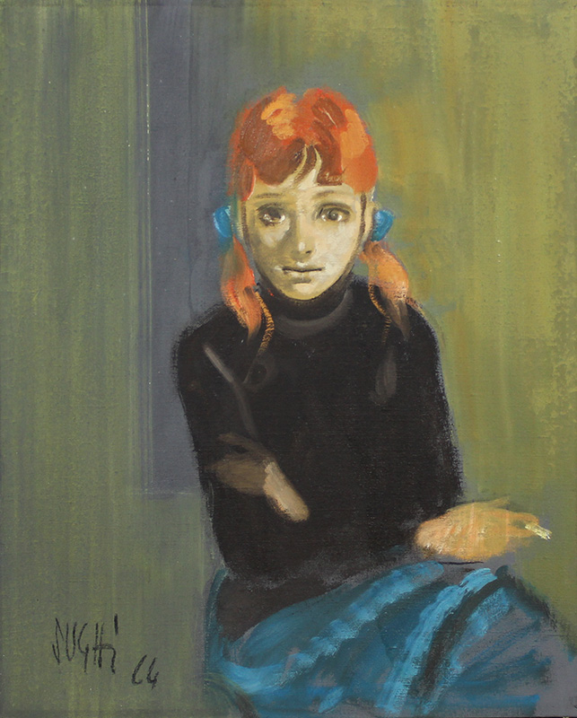Sughi Alberto Ragazza seduta, 1964 olio su tela, cm 60x50 firmato e datato in basso a sinistra, timbro Morra Arte Studio al retro, certificato di autenticità dell'artista su fotografia