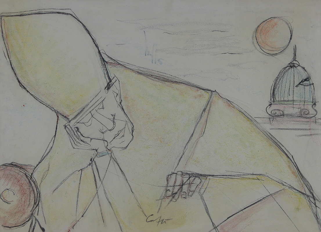 Caffè Nino Cardinale tecnica mista su tela, cm 50x70 firmata in basso al centro, timbri illeggibili al retro, autentica dell' Associazione Nazionale Gallerie d'Arte Moderna e Cotemporanea su foto datata 1989