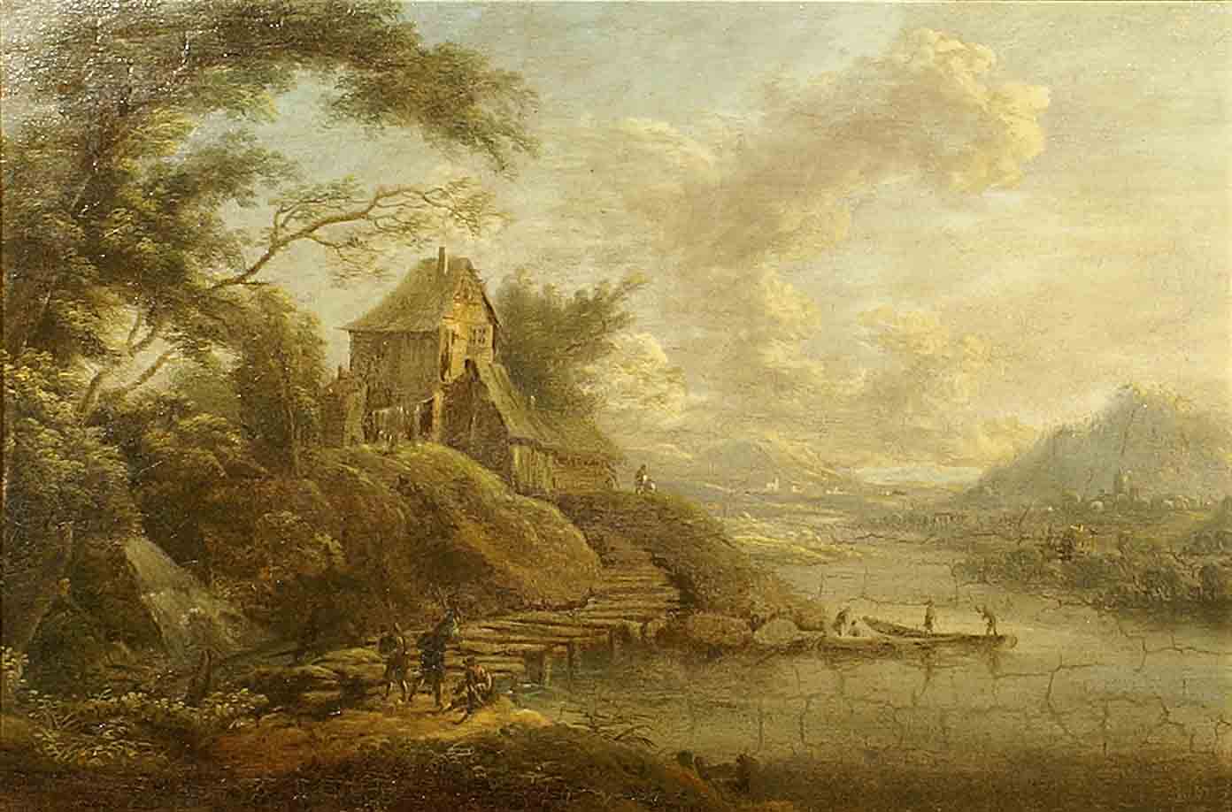 Scuola fiamminga del XVIII secolo, paesaggio con figure, olio su tavola, cm....