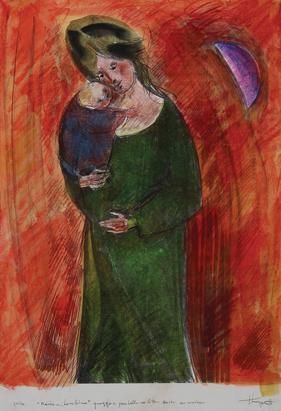 Longaretti Trento Madre e bambino, 2013 guazzo e pastello su litografia su carta, cm. 50x34,5, esemplare unico intitolato, datato e firmato in basso e al retro