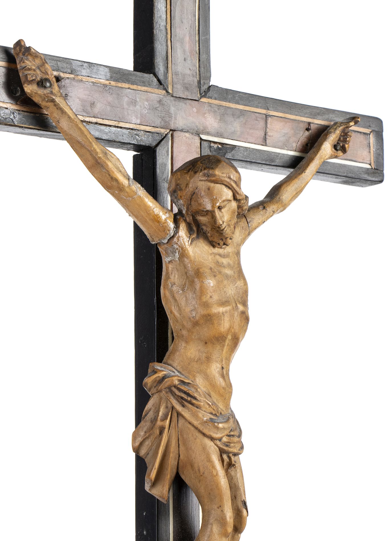 “Corpus Christi” in legno intagliato a tutto tondo e composto da tre pezzi corrispondenti alle braccia e al corpo, posto su una croce lignea con cbasamento in legno di pioppo ebanizzato con inserti in tartaruga (hawksbill sea turtle, Eretmochelys imbricata, Cheloniidae). Il Cristo è rappresentato con la testa leggermente inclinata verso la spalla destra barba che segue la mascella e piedi incrociatii. Il perizoma si presenta drappeggiato verticalmente e ricade lungo il fianco destro.