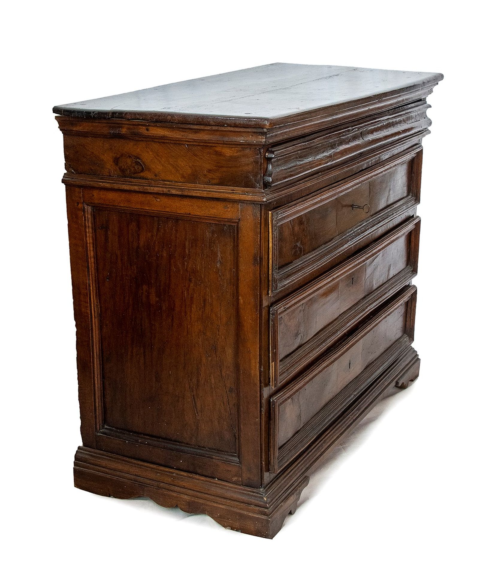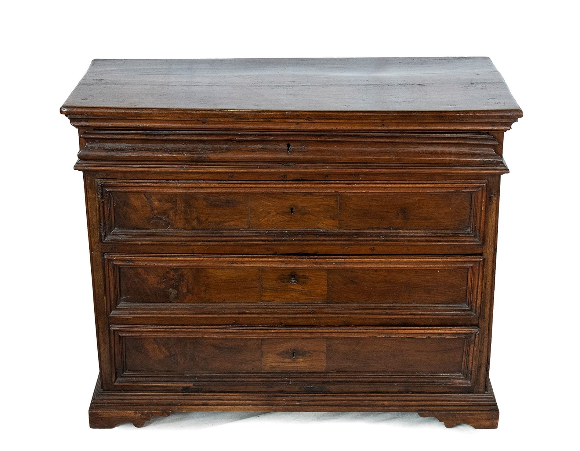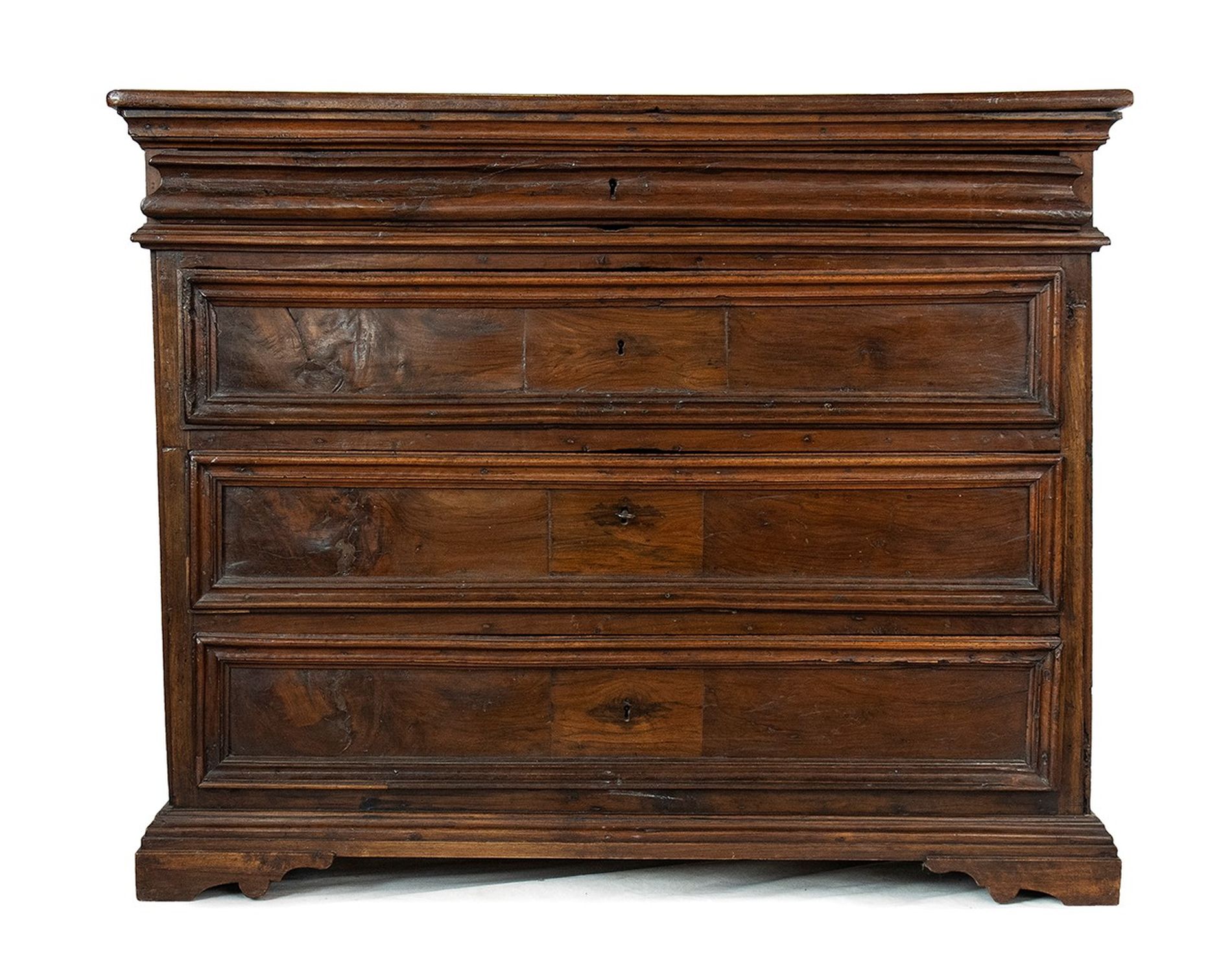 Canterano barocco in noce - Italia centrale, XVIII secolo a tre cassetti più uno nella fascia, montanti a lesena con piano modanato, piedi a mensola sagomati.