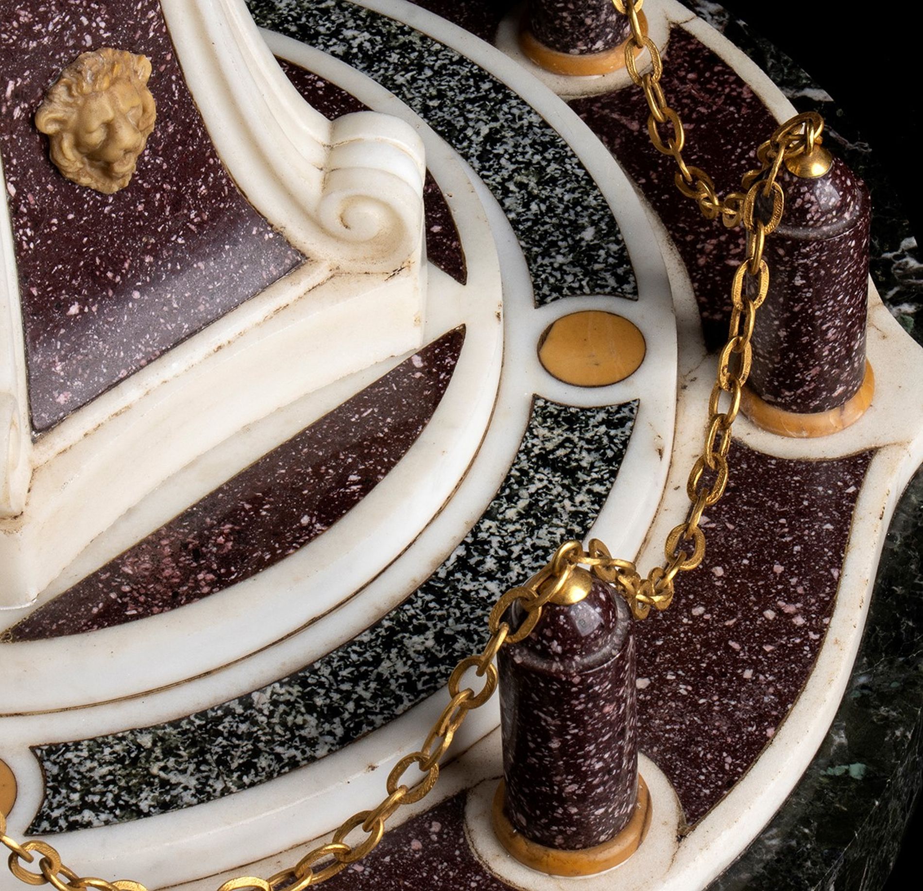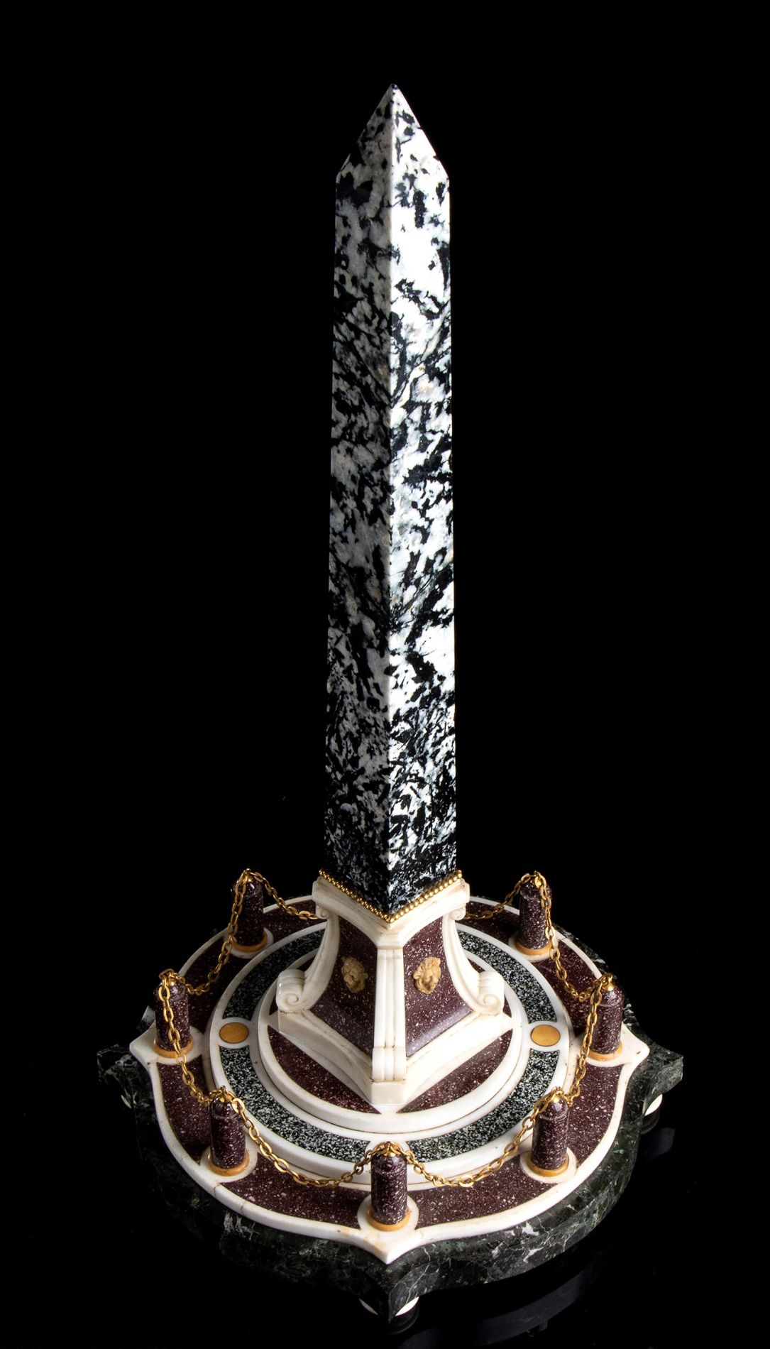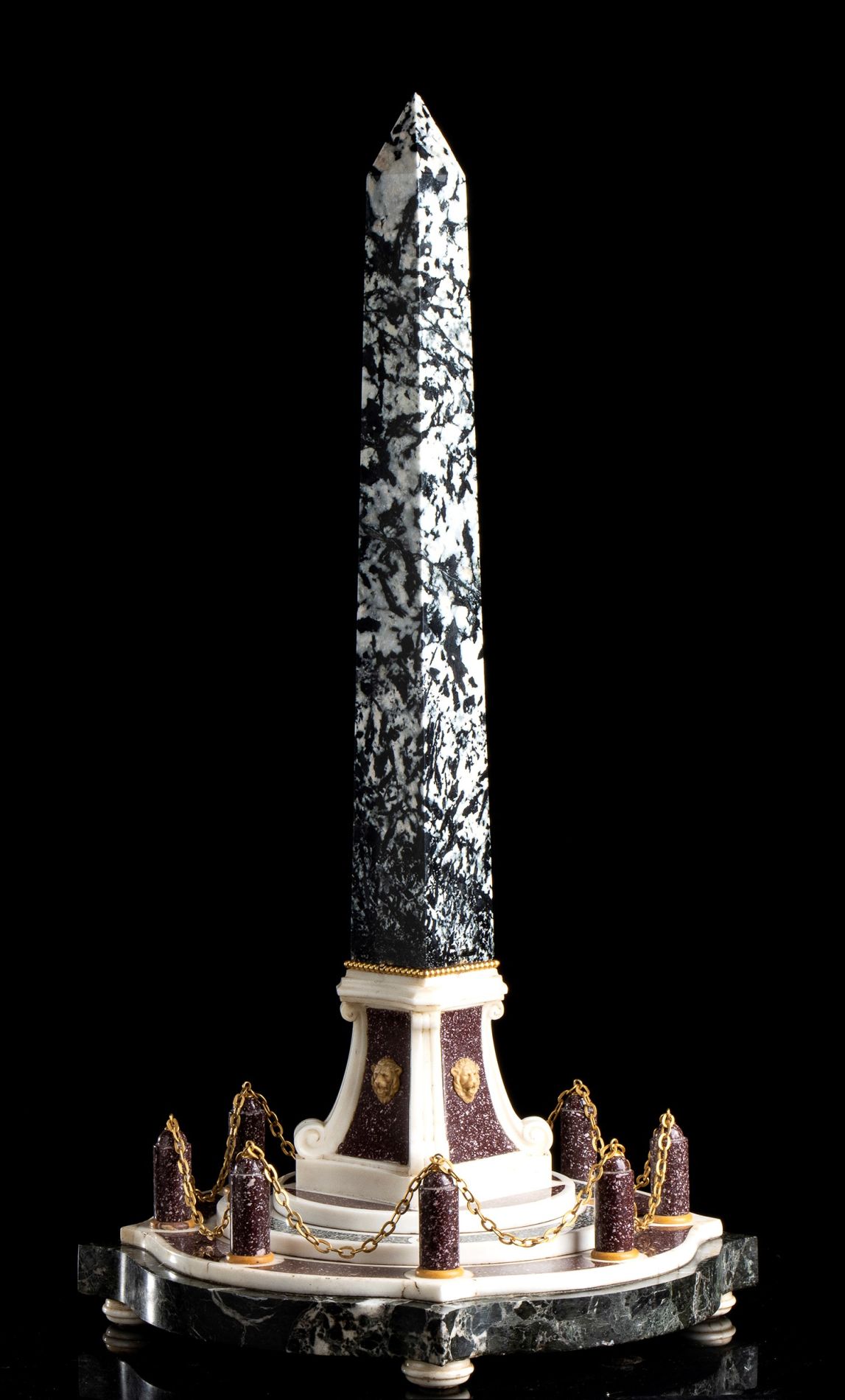 Obelisco in marmo - Roma, XIX secolo raffigurante l'obelisco di piazza del Vaticano, con quattro teste di leone. Costruito in vari tipi di marmo tra cui “Bianco statuario”, “Giallo Siena”, “Porfido Verde serpentino” e “Porfido rosso”.